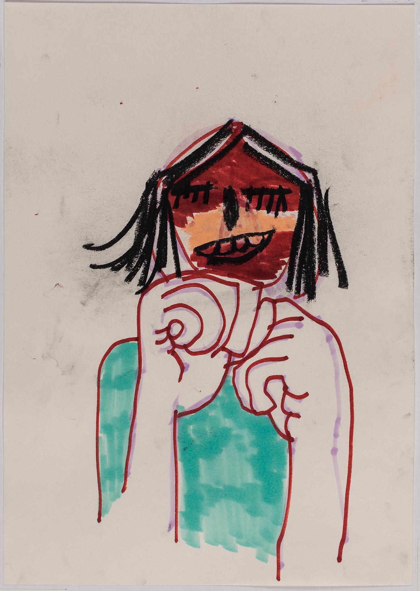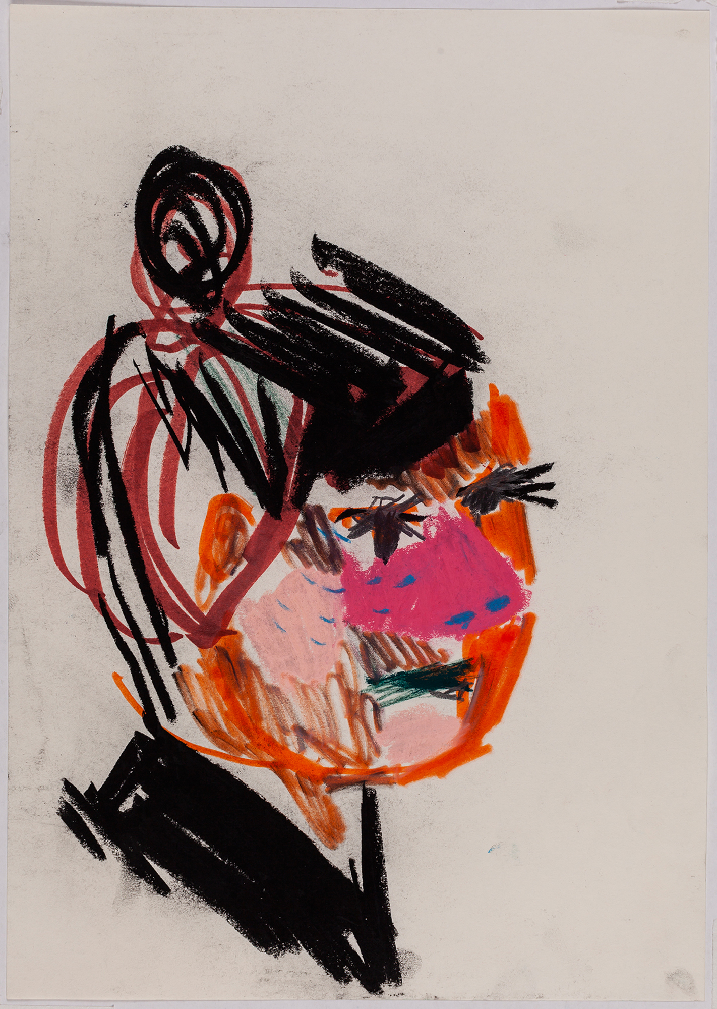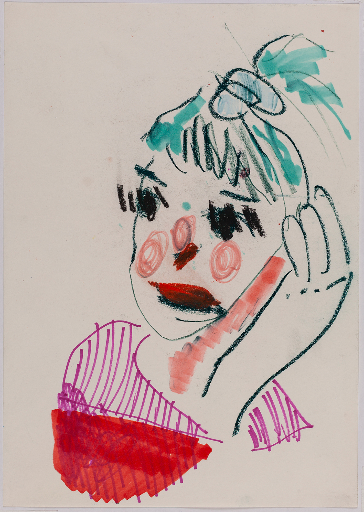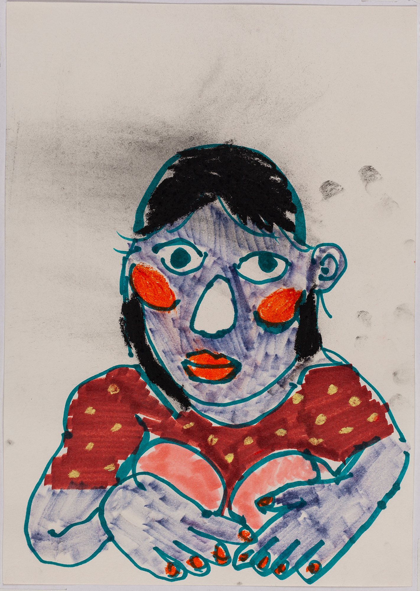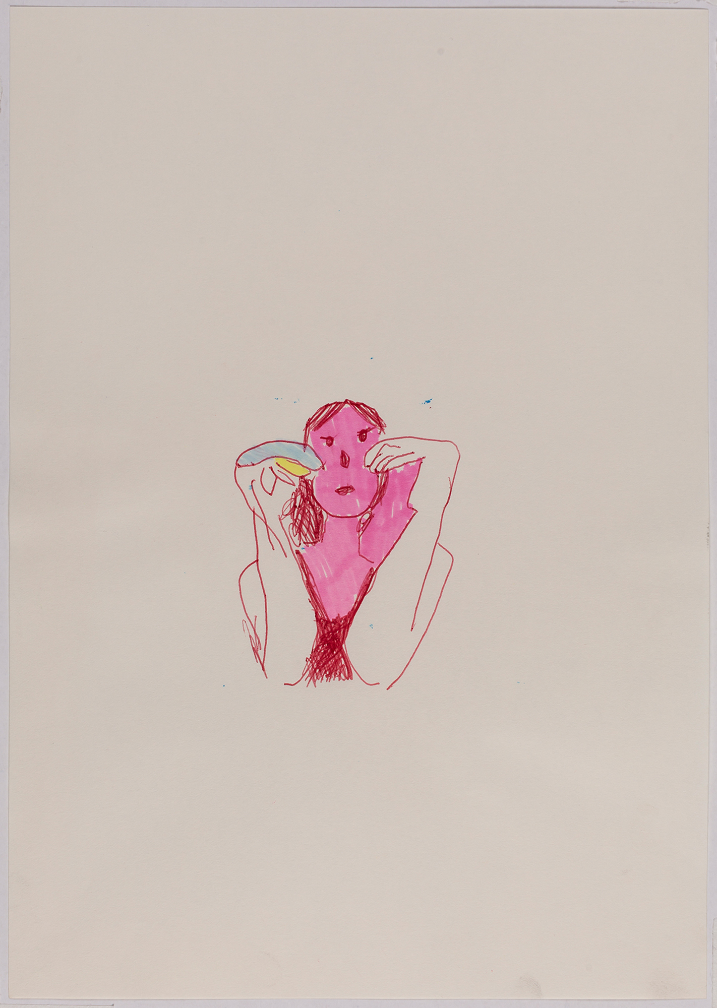 This exhibition by Ana Prata seems to be divided into two sets of works of dimensions and genres very diverse, to some extent even antithetical. However, if we examine the works carefully, what seems contradictory turns out to be much more complex. On the one hand, there are the 33 portraits on paper: small, intimate, always done on white, mainly with a pen, but also with a ballpoint pen, dry pastel, oil pastel, colored pencils, charcoal, and graphite. In this series, titled Portraits of Bia, from 2016, the broad and colorful outline predominates, as if Ana was in a hurry to register the pose of the model in front of her, or as if rehearsing to draw as a child again. More than observation drawings from the same person – Bia, who was an assistant of the artist during that year – are records of domestic and everyday performances, such as raising the arms above the head, supporting the hand on the chin, close the eyes, tie the hair in a high ponytail, and so on. Rather than as an artist and model, the relationship that seems to be established there is that of director and actress of a small theater, as if it was only possible to construct the character through the staging, in the manner of Paula Rego in her work with Lila Nunes, her friend, assistant and model of predilection for decades. With a difference that seems decisive to me: while the relationship between the Portuguese painter and her model extends for decades, which leads to a thickening of the nexus between performance and pictorial representation, the relation between Ana and Bia, to arrive at the type of figuration that we find here, needed a certain lightness – or, more accurately, a certain leggerezza, or lightness. Ana de-dramatizes what, in Paula Rego, would solve itself in the propensity to the tragic.