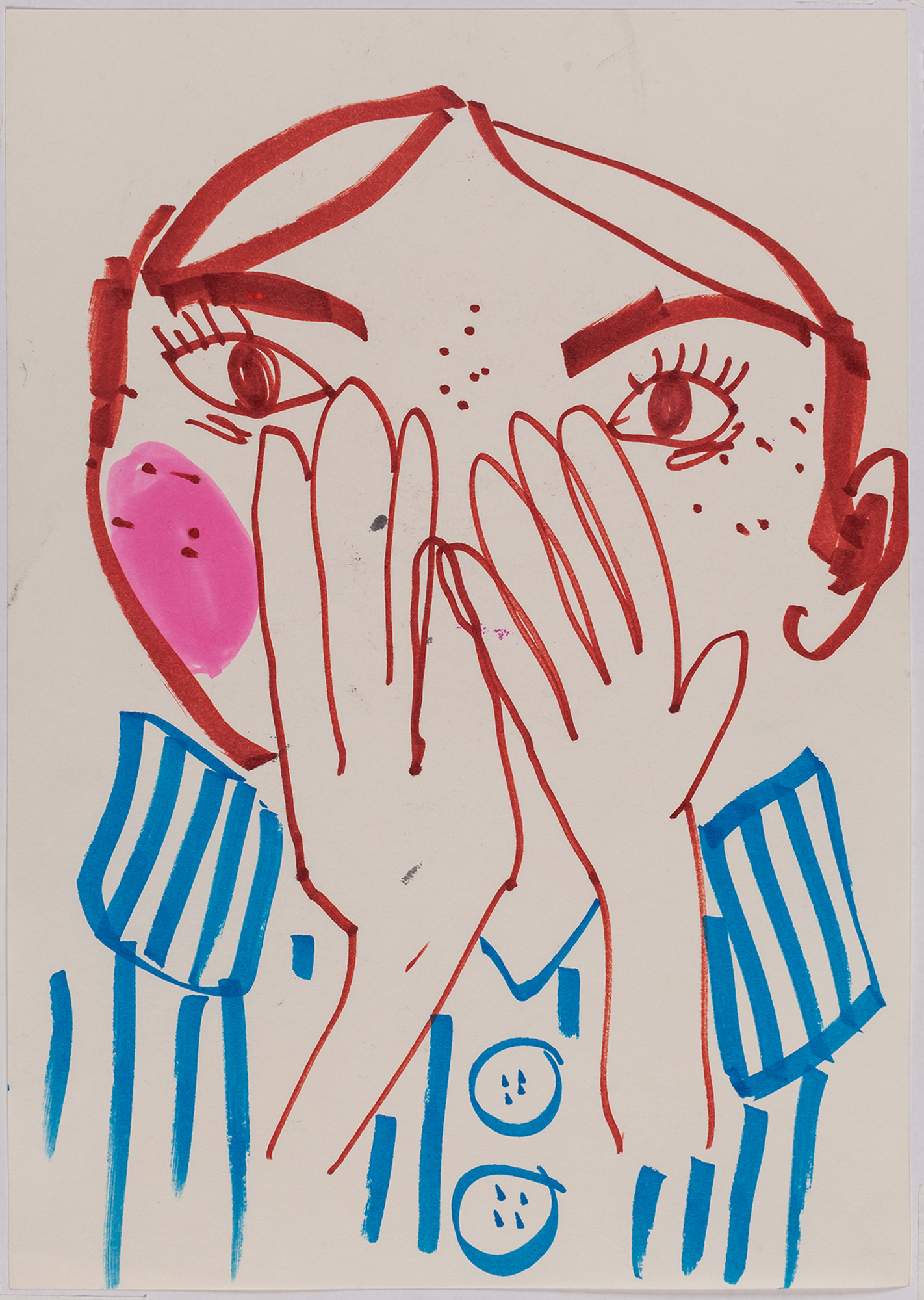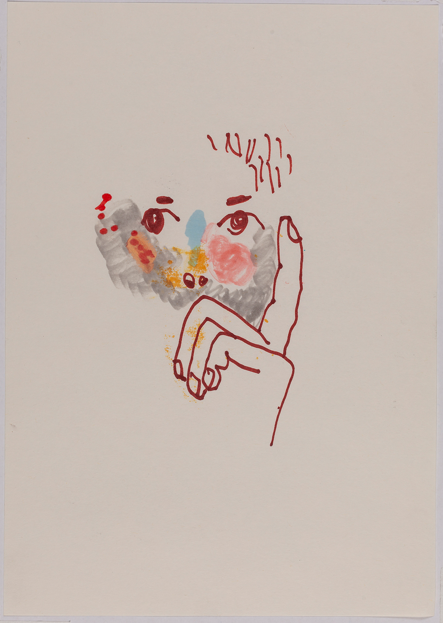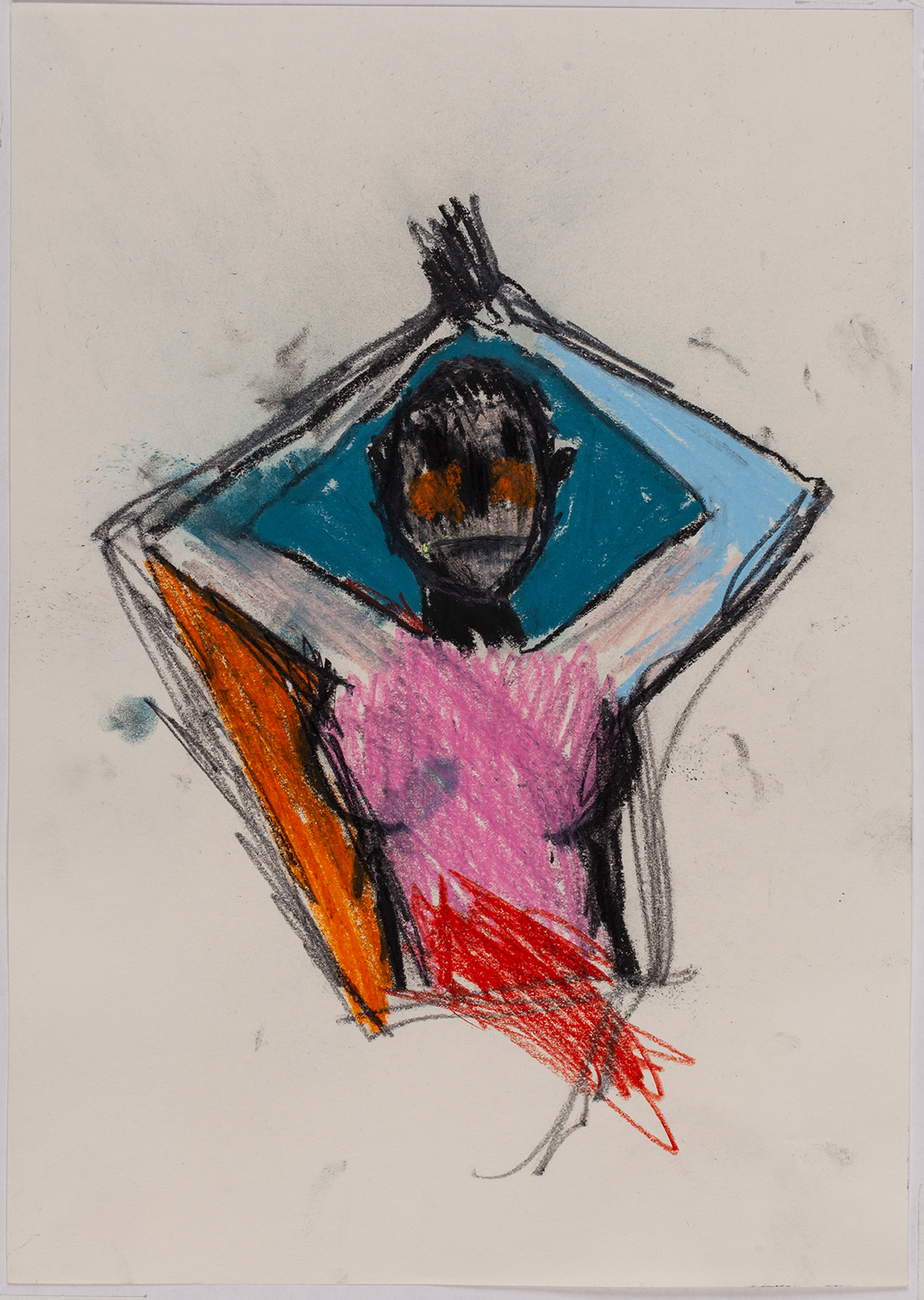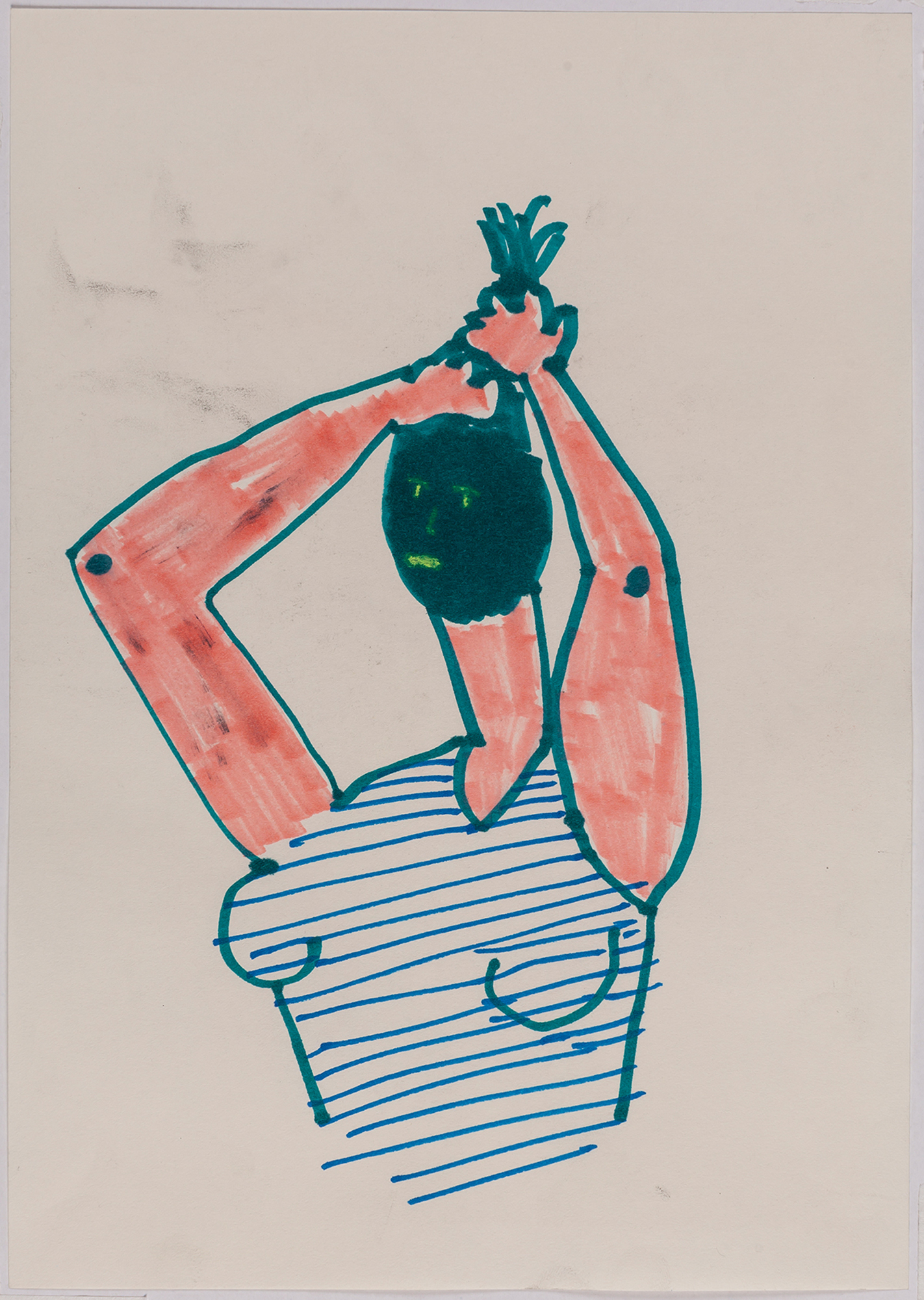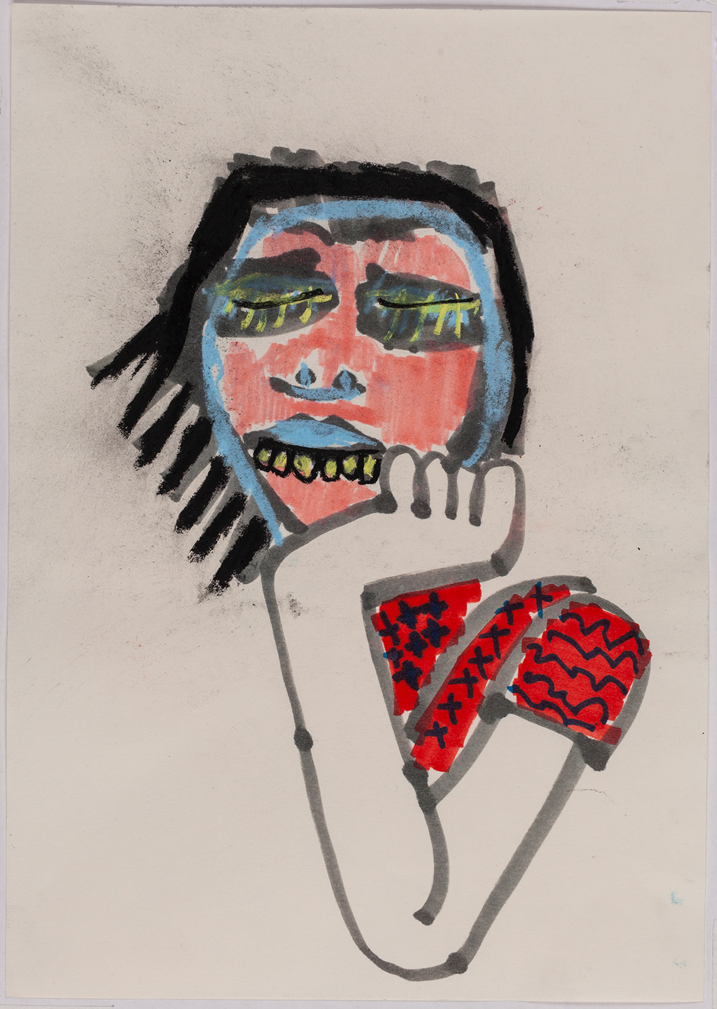 This exhibition by Ana Prata seems to be divided into two sets of works of dimensions and genres very diverse, to some extent even antithetical. However, if we examine the works carefully, what seems contradictory turns out to be much more complex. On the one hand, there are the 33 portraits on paper: small, intimate, always done on white, mainly with a pen, but also with a ballpoint pen, dry pastel, oil pastel, colored pencils, charcoal, and graphite. In this series, titled Portraits of Bia, from 2016, the broad and colorful outline predominates, as if Ana was in a hurry to register the pose of the model in front of her, or as if rehearsing to draw as a child again. More than observation drawings from the same person – Bia, who was an assistant of the artist during that year – are records of domestic and everyday performances, such as raising the arms above the head, supporting the hand on the chin, close the eyes, tie the hair in a high ponytail, and so on. Rather than as an artist and model, the relationship that seems to be established there is that of director and actress of a small theater, as if it was only possible to construct the character through the staging, in the manner of Paula Rego in her work with Lila Nunes, her friend, assistant and model of predilection for decades. With a difference that seems decisive to me: while the relationship between the Portuguese painter and her model extends for decades, which leads to a thickening of the nexus between performance and pictorial representation, the relation between Ana and Bia, to arrive at the type of figuration that we find here, needed a certain lightness – or, more accurately, a certain leggerezza, or lightness. Ana de-dramatizes what, in Paula Rego, would solve itself in the propensity to the tragic.