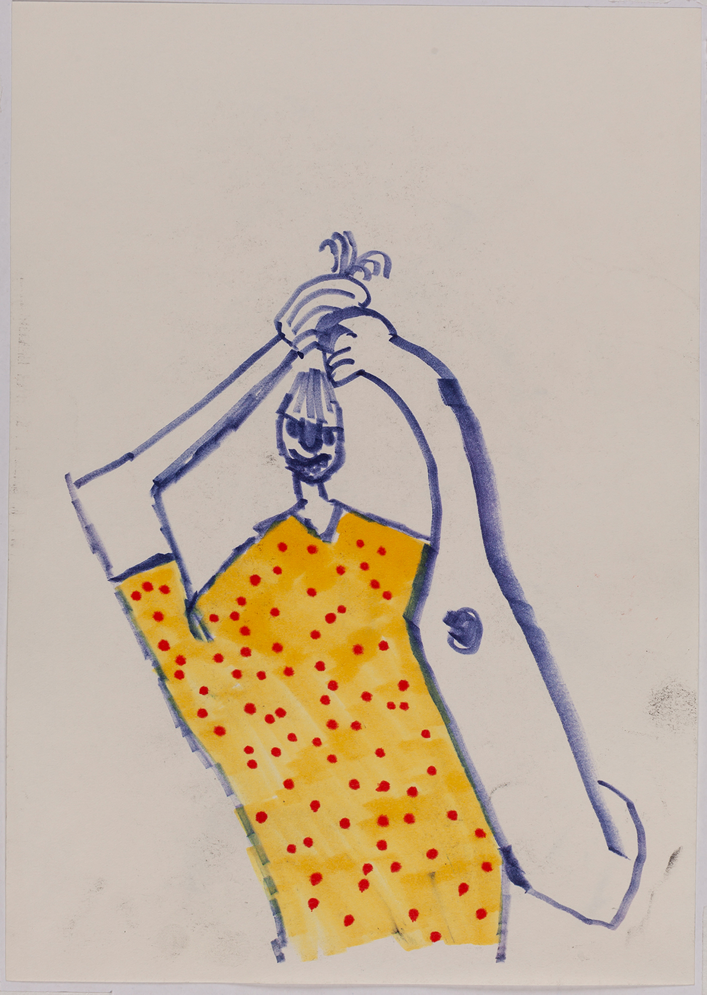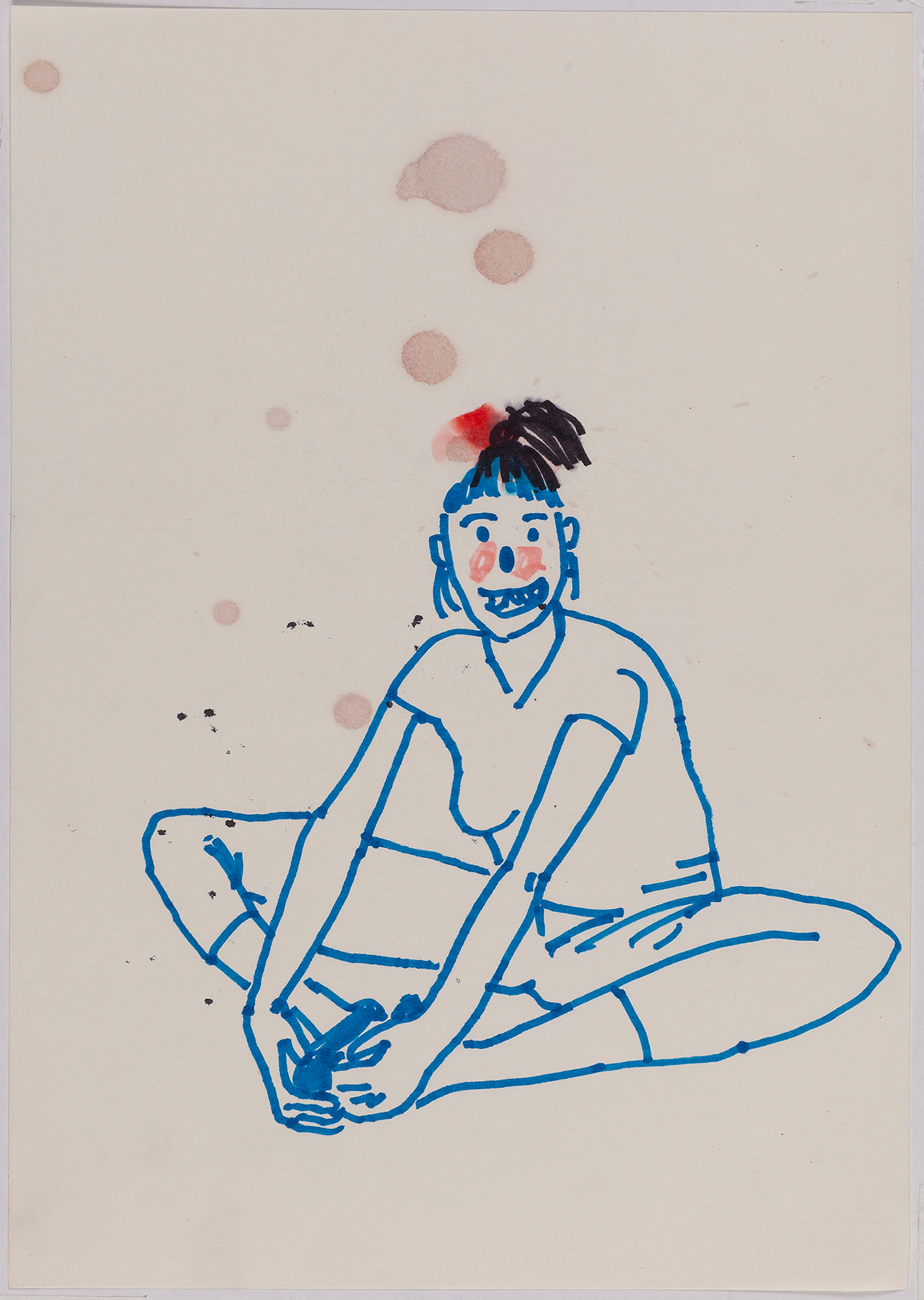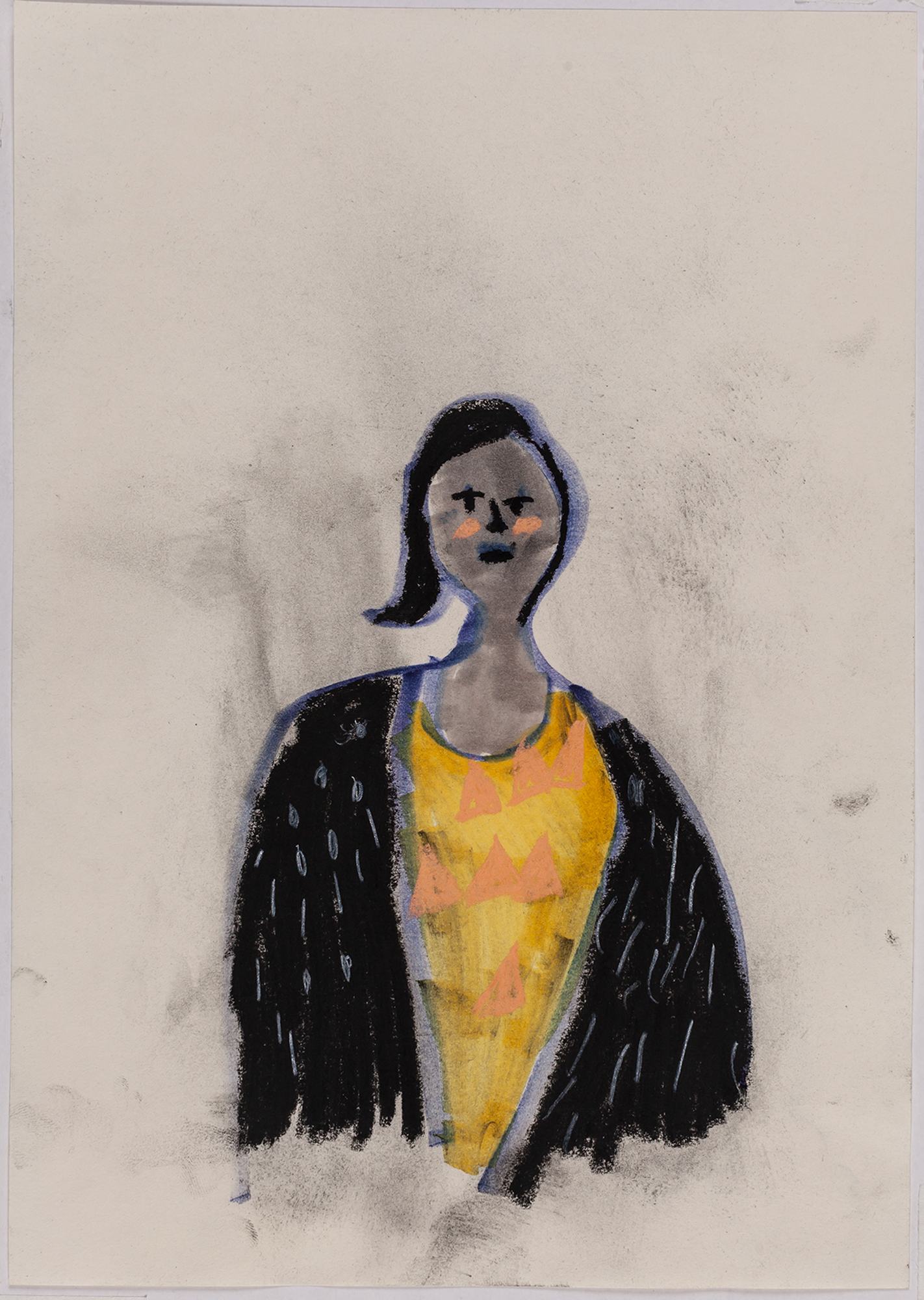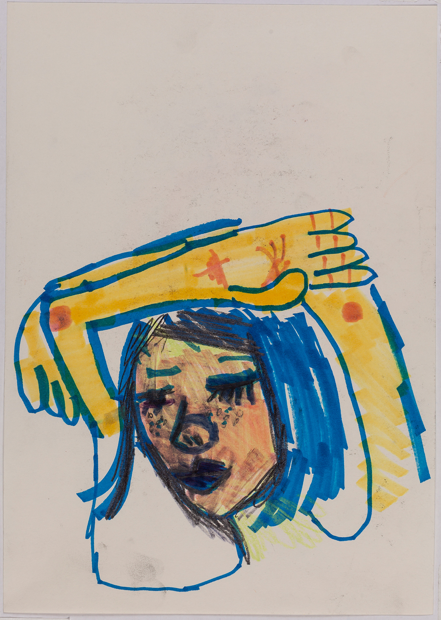 This exhibition by Ana Prata seems to be divided into two sets of works of dimensions and genres very diverse, to some extent even antithetical. However, if we examine the works carefully, what seems contradictory turns out to be much more complex. On the one hand, there are the 33 portraits on paper: small, intimate, always done on white, mainly with a pen, but also with a ballpoint pen, dry pastel, oil pastel, colored pencils, charcoal, and graphite. In this series, titled Portraits of Bia, from 2016, the broad and colorful outline predominates, as if Ana was in a hurry to register the pose of the model in front of her, or as if rehearsing to draw as a child again. More than observation drawings from the same person – Bia, who was an assistant of the artist during that year – are records of domestic and everyday performances, such as raising the arms above the head, supporting the hand on the chin, close the eyes, tie the hair in a high ponytail, and so on. Rather than as an artist and model, the relationship that seems to be established there is that of director and actress of a small theater, as if it was only possible to construct the character through the staging, in the manner of Paula Rego in her work with Lila Nunes, her friend, assistant and model of predilection for decades. With a difference that seems decisive to me: while the relationship between the Portuguese painter and her model extends for decades, which leads to a thickening of the nexus between performance and pictorial representation, the relation between Ana and Bia, to arrive at the type of figuration that we find here, needed a certain lightness – or, more accurately, a certain leggerezza, or lightness. Ana de-dramatizes what, in Paula Rego, would solve itself in the propensity to the tragic.