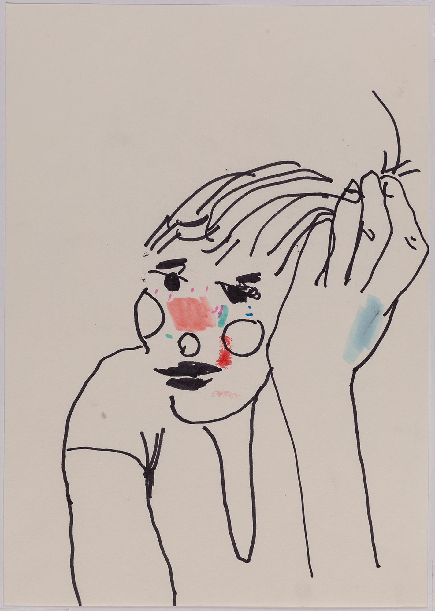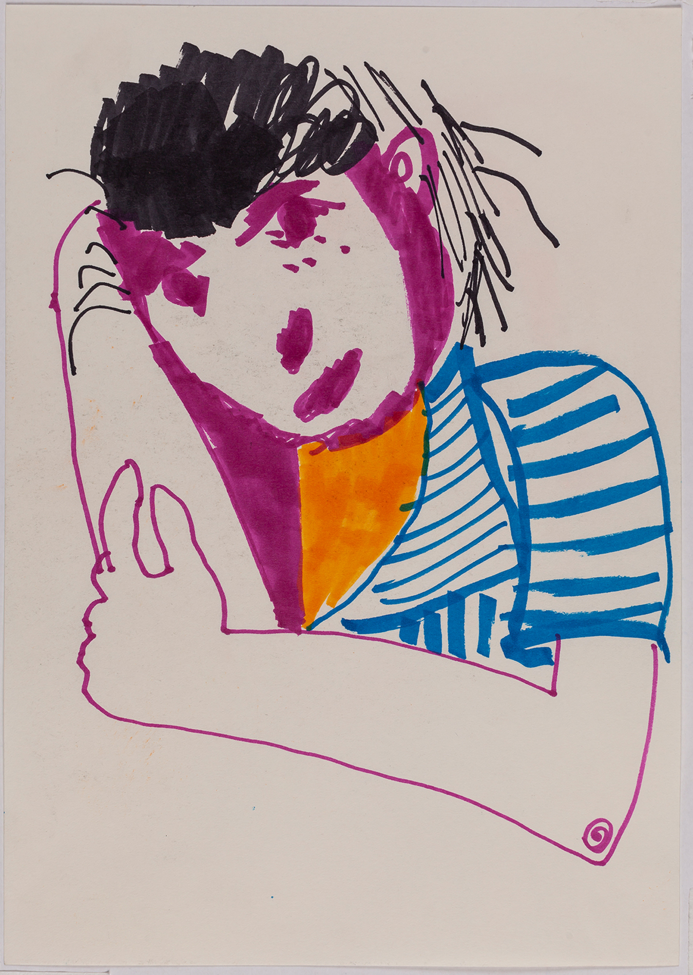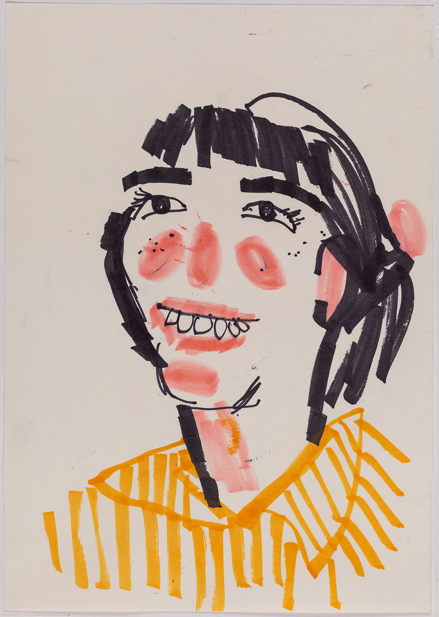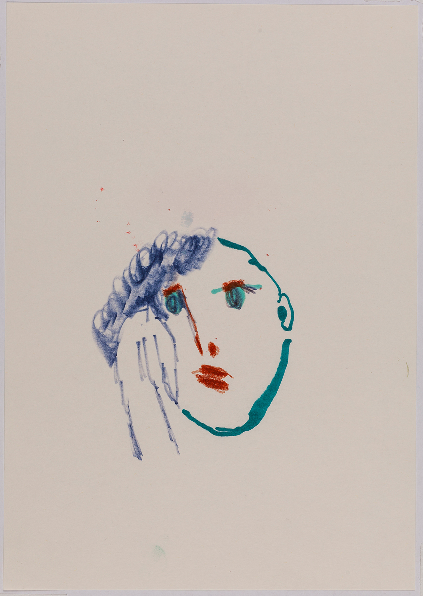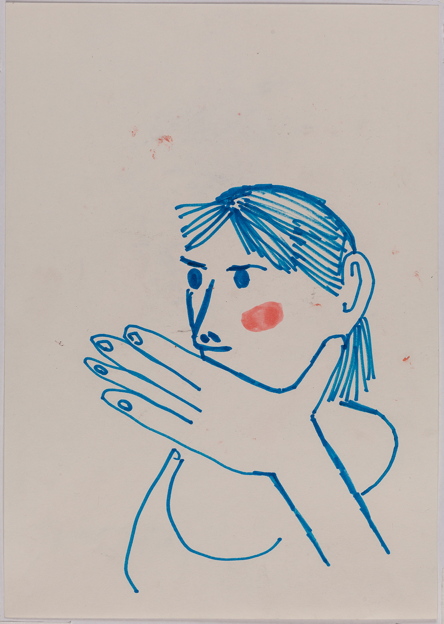 This exhibition by Ana Prata seems to be divided into two sets of works of dimensions and genres very diverse, to some extent even antithetical. However, if we examine the works carefully, what seems contradictory turns out to be much more complex. On the one hand, there are the 33 portraits on paper: small, intimate, always done on white, mainly with a pen, but also with a ballpoint pen, dry pastel, oil pastel, colored pencils, charcoal, and graphite. In this series, titled Portraits of Bia, from 2016, the broad and colorful outline predominates, as if Ana was in a hurry to register the pose of the model in front of her, or as if rehearsing to draw as a child again. More than observation drawings from the same person – Bia, who was an assistant of the artist during that year – are records of domestic and everyday performances, such as raising the arms above the head, supporting the hand on the chin, close the eyes, tie the hair in a high ponytail, and so on. Rather than as an artist and model, the relationship that seems to be established there is that of director and actress of a small theater, as if it was only possible to construct the character through the staging, in the manner of Paula Rego in her work with Lila Nunes, her friend, assistant and model of predilection for decades. With a difference that seems decisive to me: while the relationship between the Portuguese painter and her model extends for decades, which leads to a thickening of the nexus between performance and pictorial representation, the relation between Ana and Bia, to arrive at the type of figuration that we find here, needed a certain lightness – or, more accurately, a certain leggerezza, or lightness. Ana de-dramatizes what, in Paula Rego, would solve itself in the propensity to the tragic.