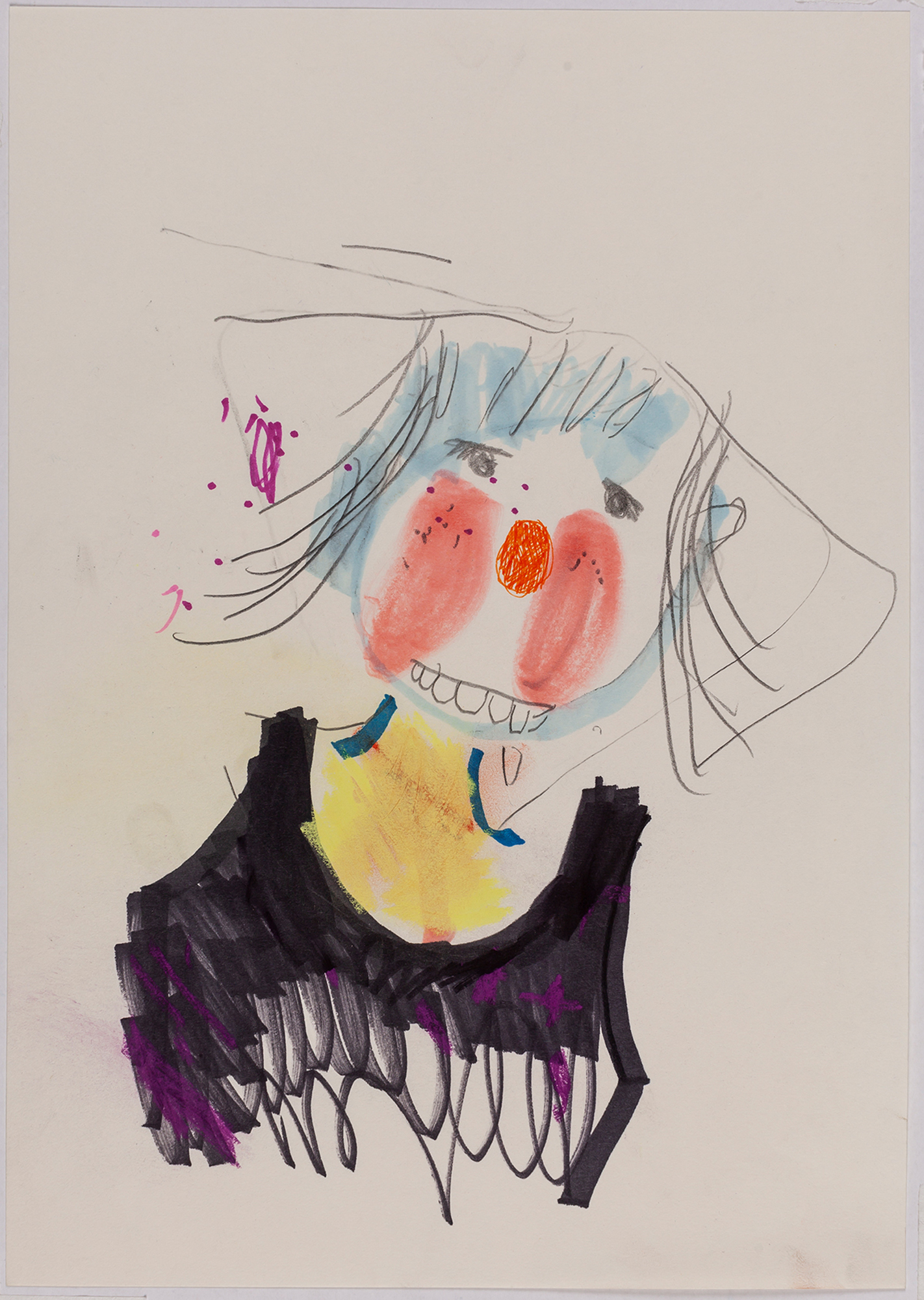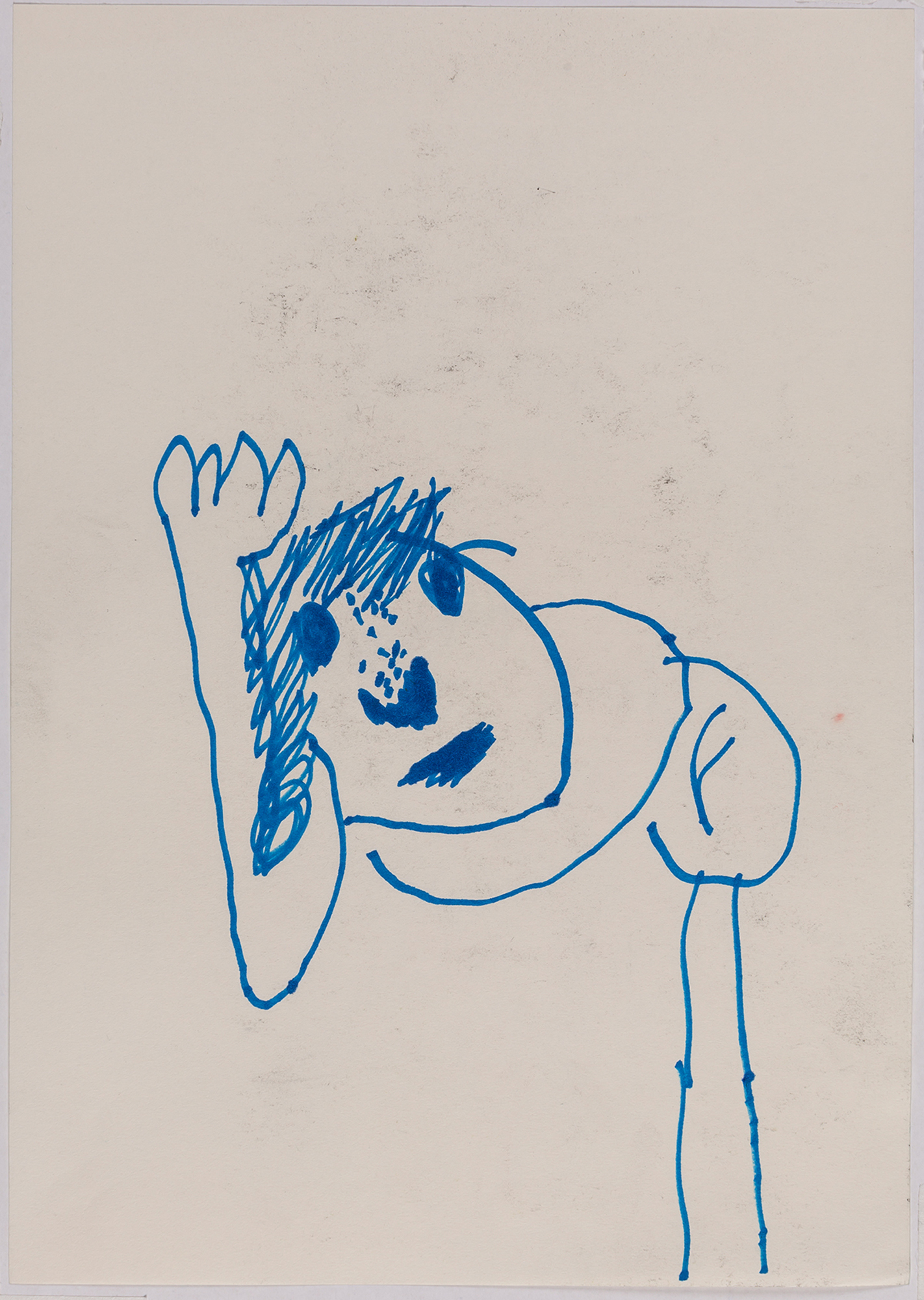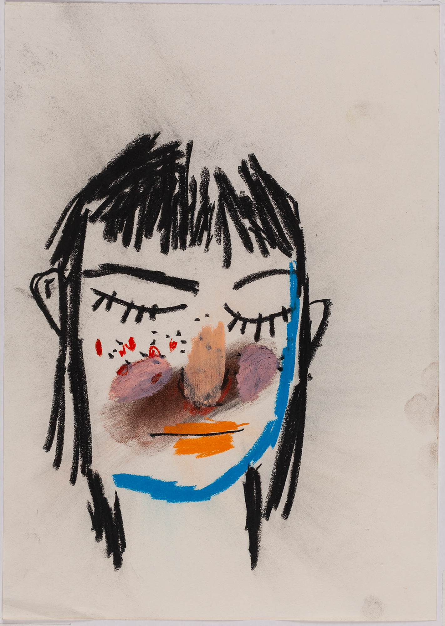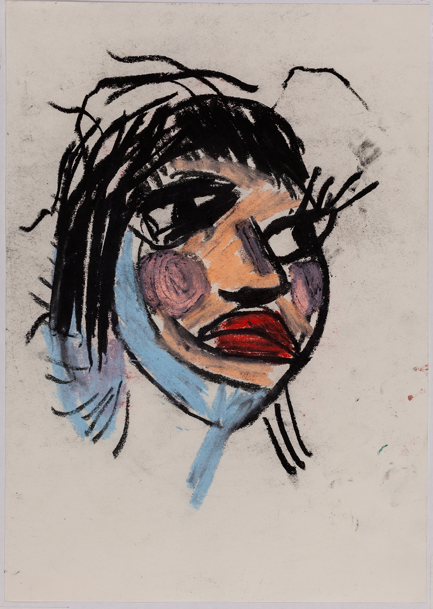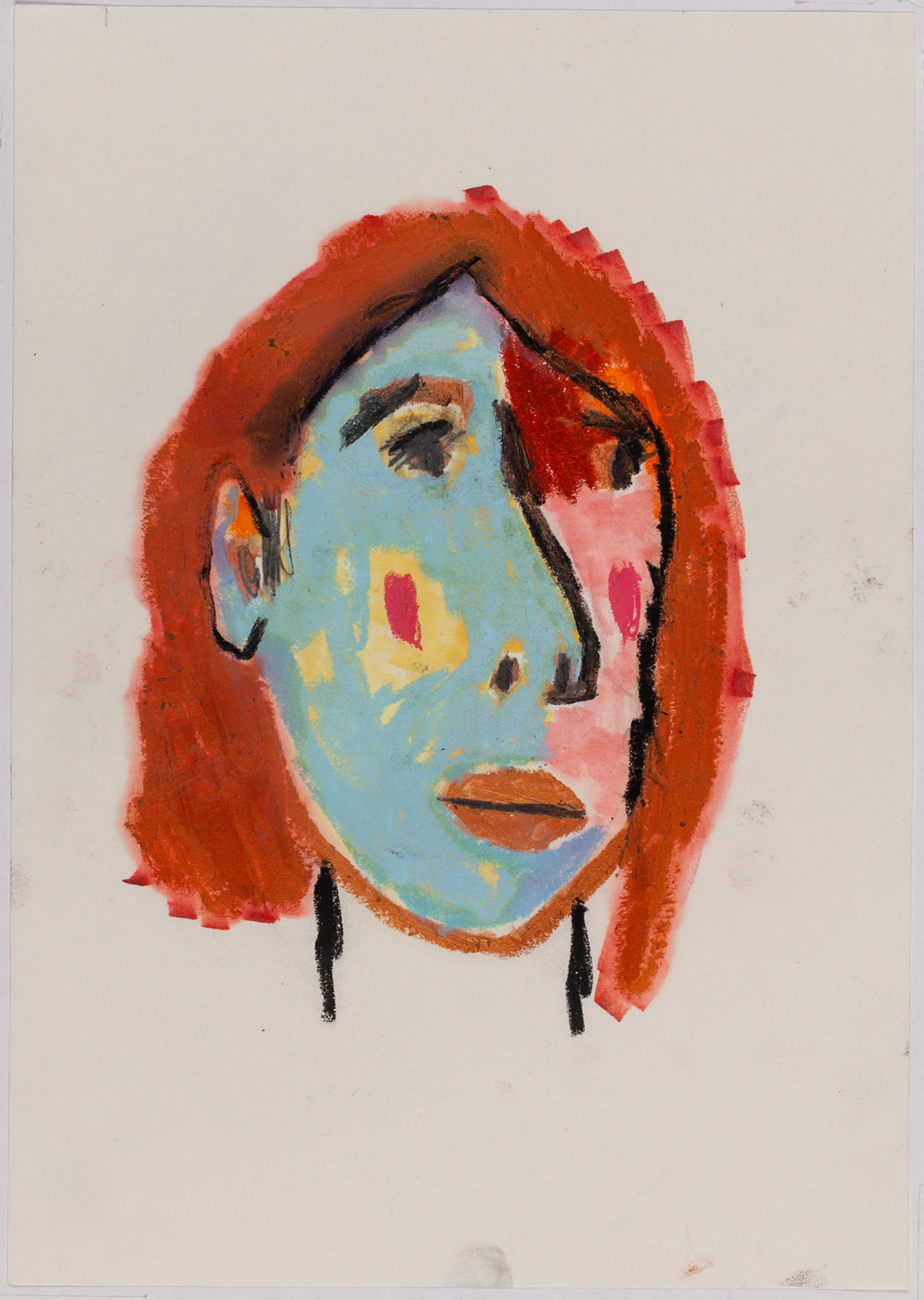This exhibition by Ana Prata seems to be divided into two sets of works of dimensions and genres very diverse, to some extent even antithetical. However, if we examine the works carefully, what seems contradictory turns out to be much more complex. On the one hand, there are the 33 portraits on paper: small, intimate, always done on white, mainly with a pen, but also with a ballpoint pen, dry pastel, oil pastel, colored pencils, charcoal, and graphite. In this series, titled Portraits of Bia, from 2016, the broad and colorful outline predominates, as if Ana was in a hurry to register the pose of the model in front of her, or as if rehearsing to draw as a child again. More than observation drawings from the same person – Bia, who was an assistant of the artist during that year – are records of domestic and everyday performances, such as raising the arms above the head, supporting the hand on the chin, close the eyes, tie the hair in a high ponytail, and so on. Rather than as an artist and model, the relationship that seems to be established there is that of director and actress of a small theater, as if it was only possible to construct the character through the staging, in the manner of Paula Rego in her work with Lila Nunes, her friend, assistant and model of predilection for decades. With a difference that seems decisive to me: while the relationship between the Portuguese painter and her model extends for decades, which leads to a thickening of the nexus between performance and pictorial representation, the relation between Ana and Bia, to arrive at the type of figuration that we find here, needed a certain lightness – or, more accurately, a certain leggerezza, or lightness. Ana de-dramatizes what, in Paula Rego, would solve itself in the propensity to the tragic.