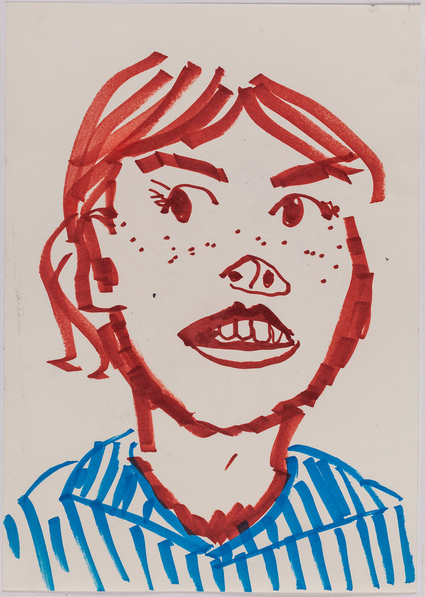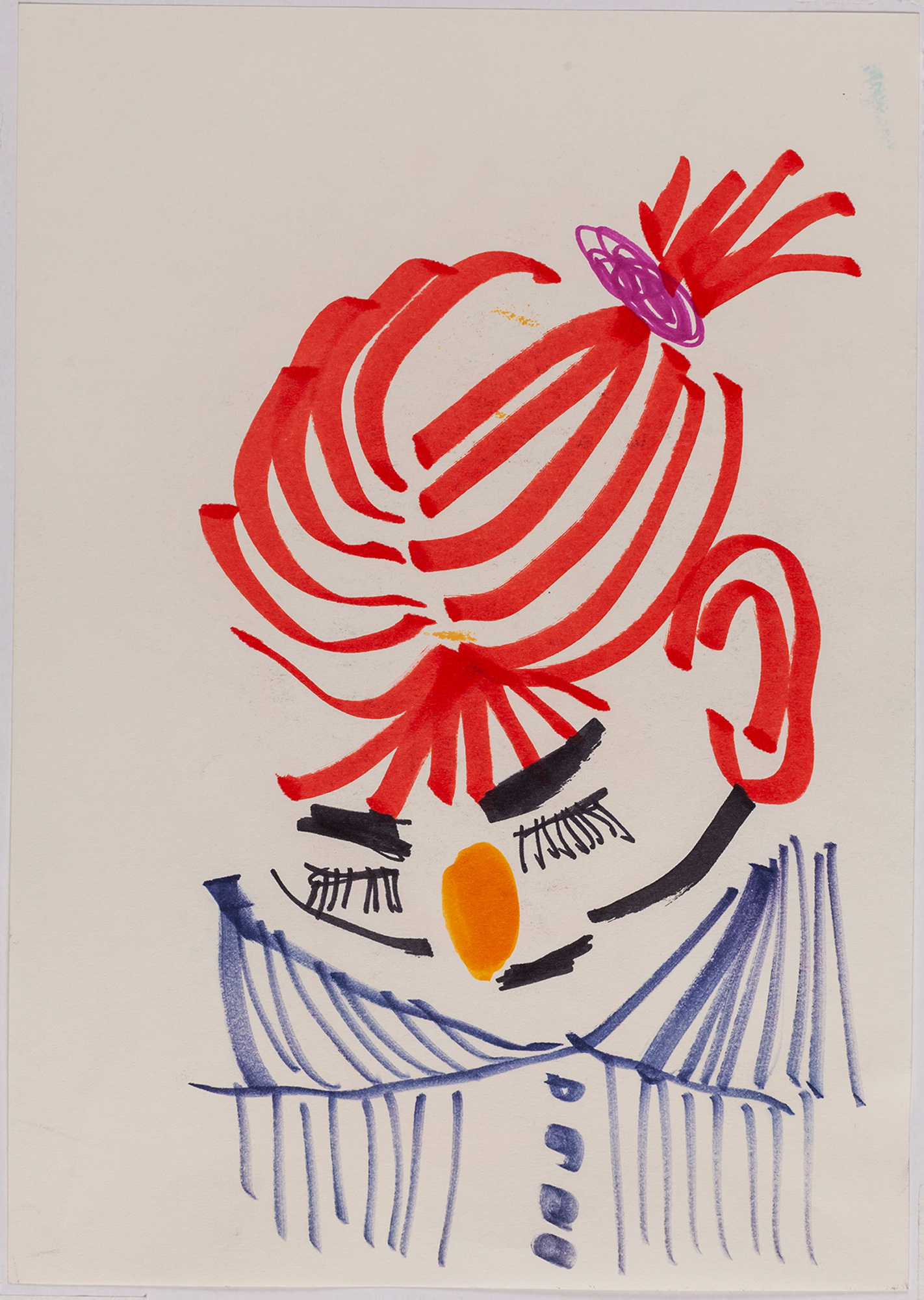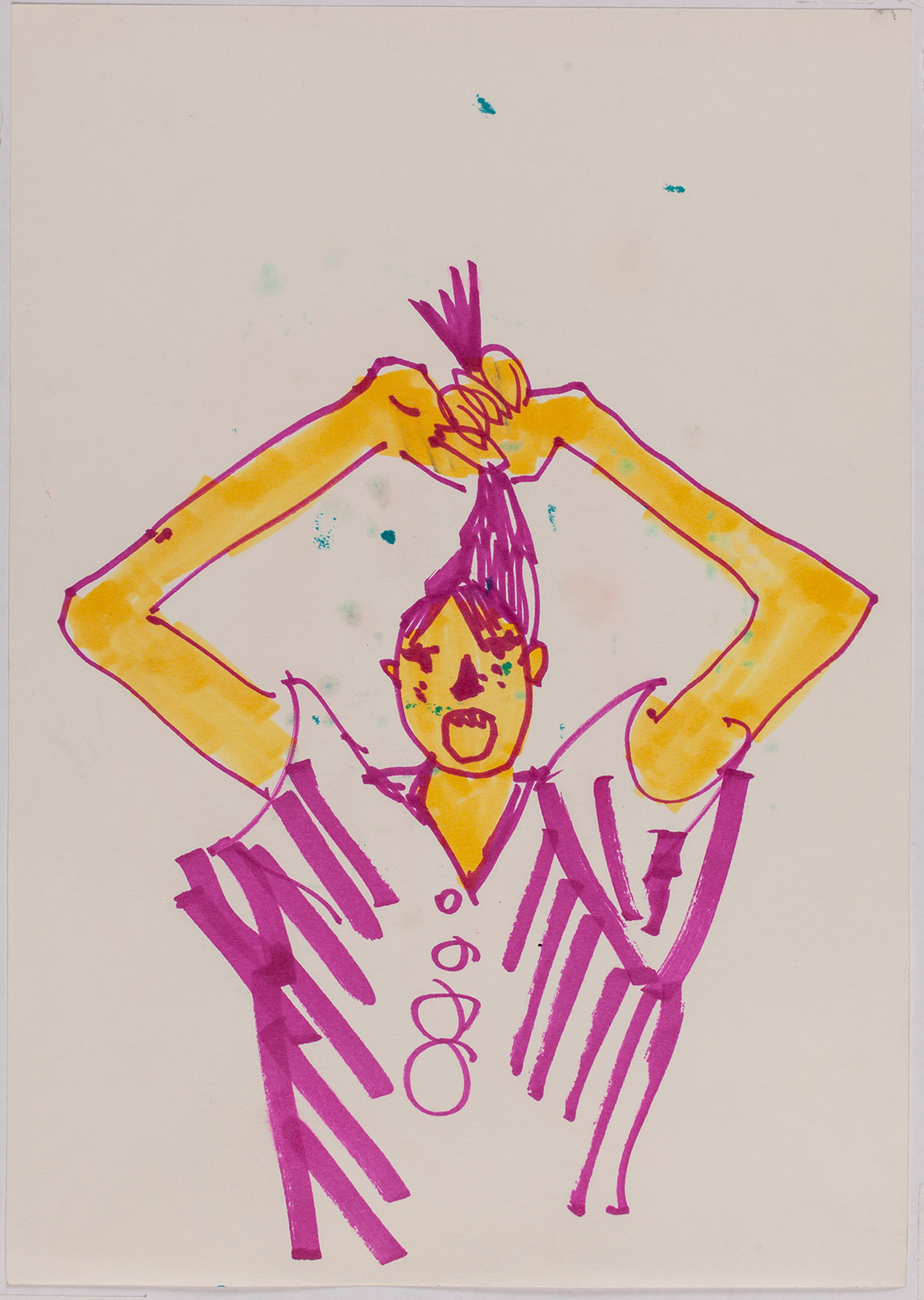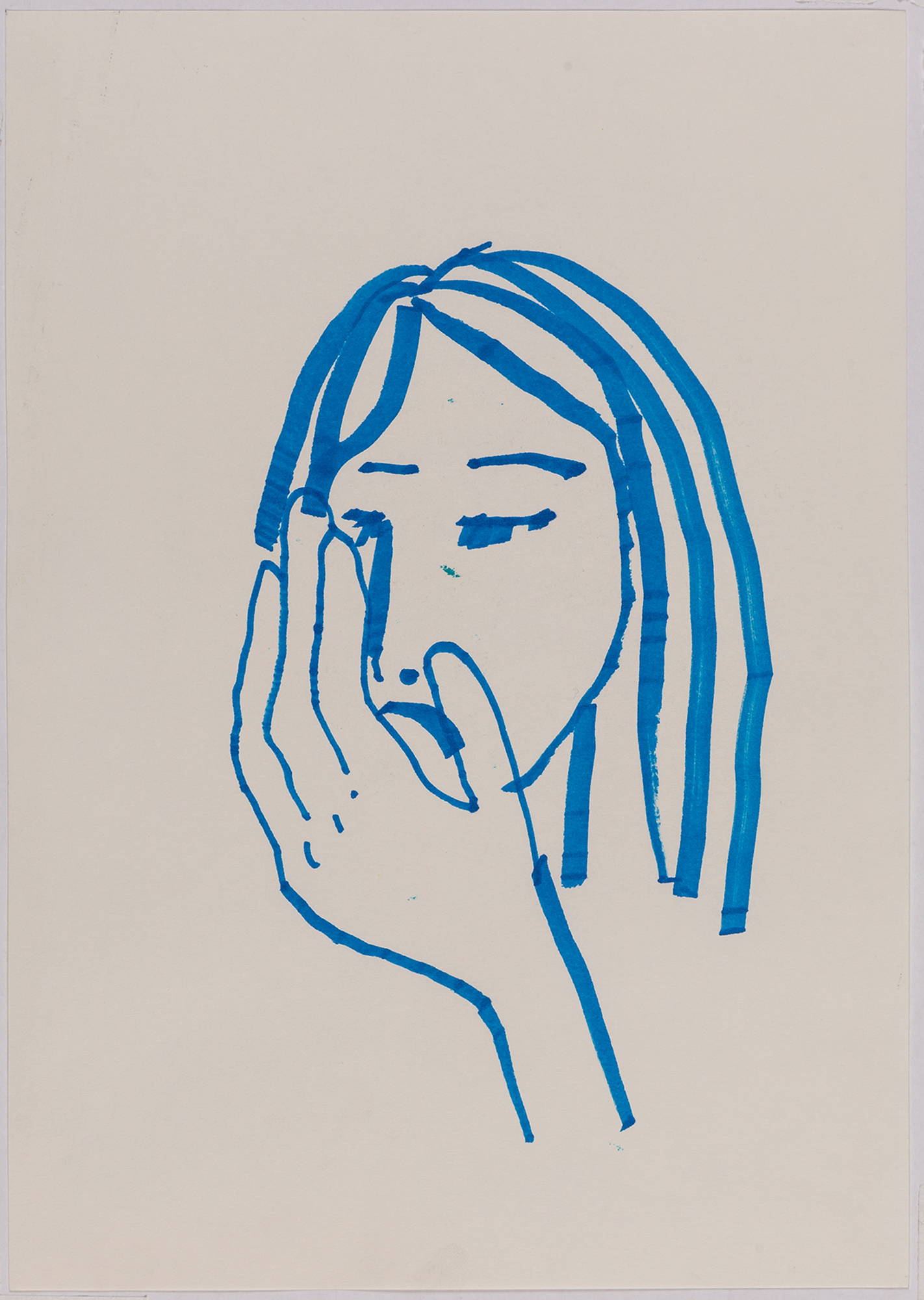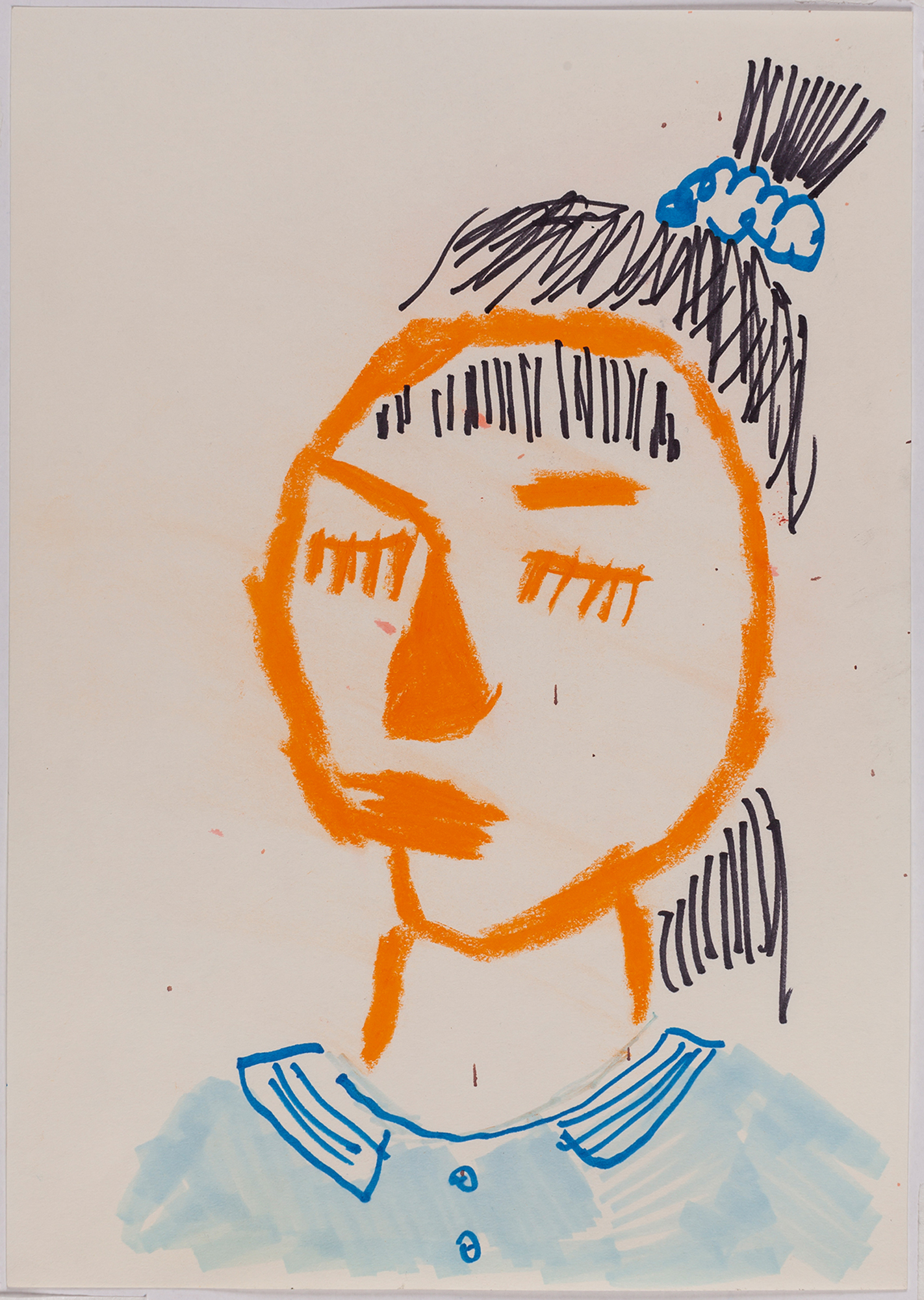 This exhibition by Ana Prata seems to be divided into two sets of works of dimensions and genres very diverse, to some extent even antithetical. However, if we examine the works carefully, what seems contradictory turns out to be much more complex. On the one hand, there are the 33 portraits on paper: small, intimate, always done on white, mainly with a pen, but also with a ballpoint pen, dry pastel, oil pastel, colored pencils, charcoal, and graphite. In this series, titled Portraits of Bia, from 2016, the broad and colorful outline predominates, as if Ana was in a hurry to register the pose of the model in front of her, or as if rehearsing to draw as a child again. More than observation drawings from the same person – Bia, who was an assistant of the artist during that year – are records of domestic and everyday performances, such as raising the arms above the head, supporting the hand on the chin, close the eyes, tie the hair in a high ponytail, and so on. Rather than as an artist and model, the relationship that seems to be established there is that of director and actress of a small theater, as if it was only possible to construct the character through the staging, in the manner of Paula Rego in her work with Lila Nunes, her friend, assistant and model of predilection for decades. With a difference that seems decisive to me: while the relationship between the Portuguese painter and her model extends for decades, which leads to a thickening of the nexus between performance and pictorial representation, the relation between Ana and Bia, to arrive at the type of figuration that we find here, needed a certain lightness – or, more accurately, a certain leggerezza, or lightness. Ana de-dramatizes what, in Paula Rego, would solve itself in the propensity to the tragic.