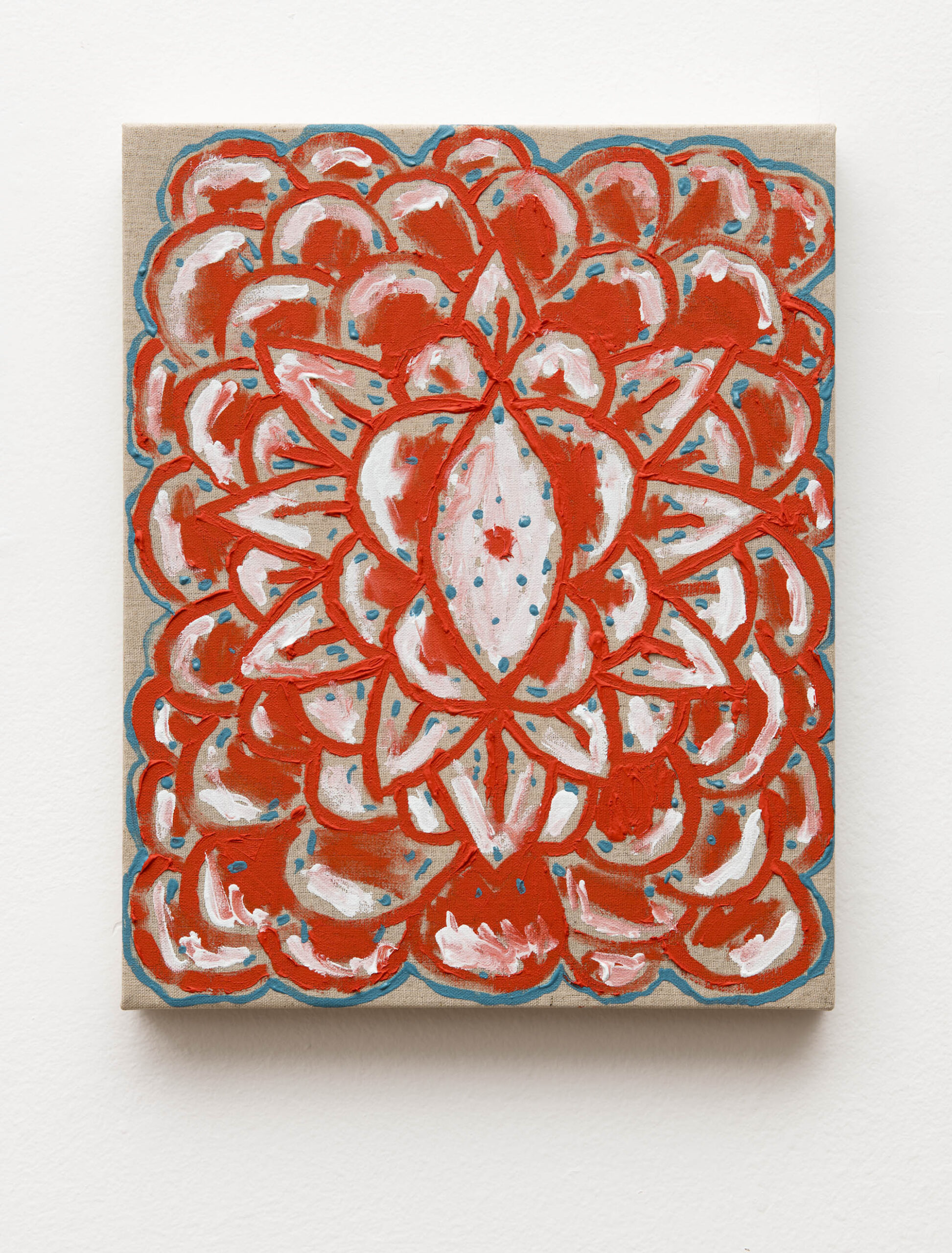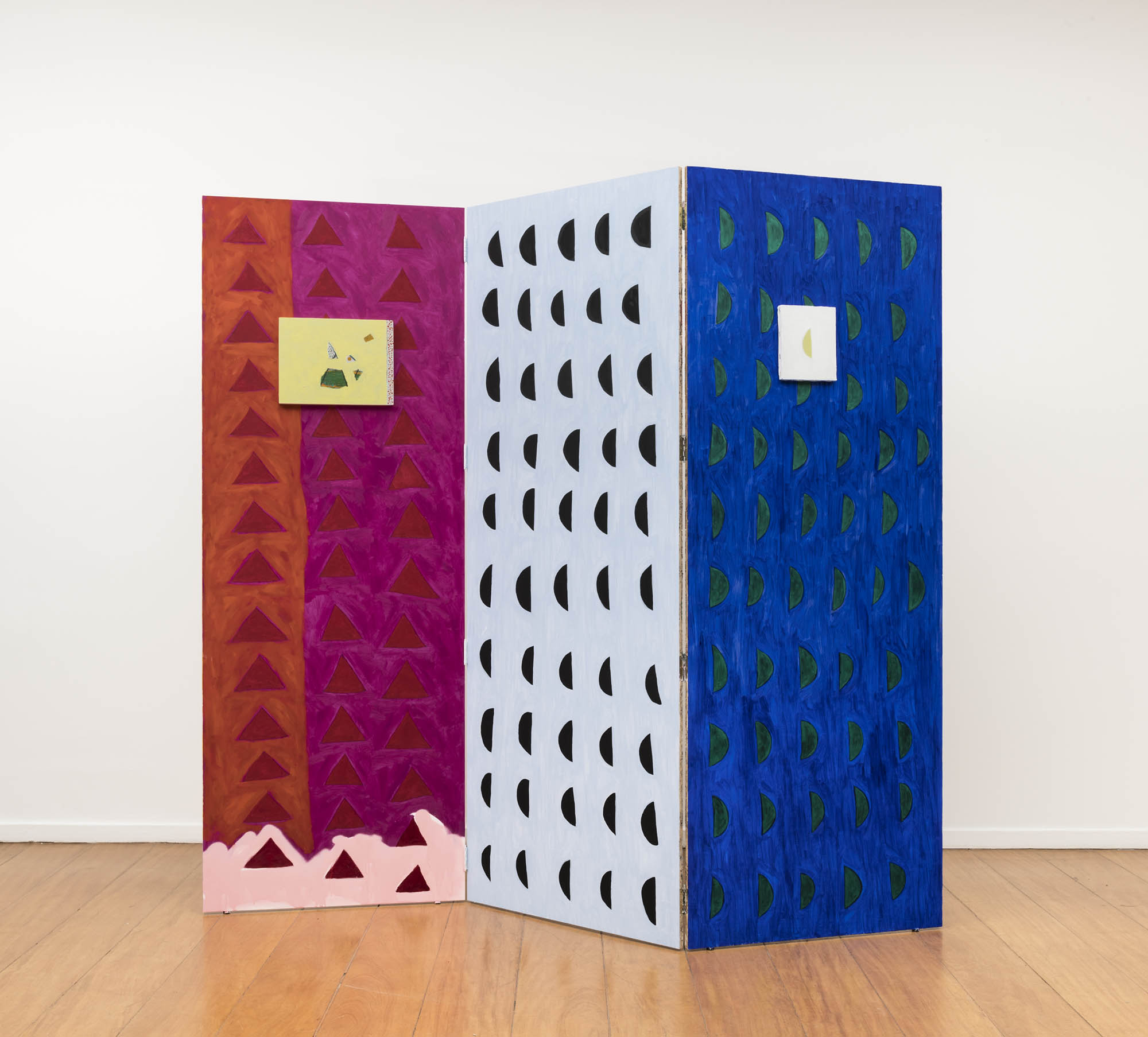 face of this same screen and the two faces of the other screen), Ana uses the folding structure as if it were a single frame. Two-sided paintings present dissenting paintings, which at first glance seem not to dialogue with one another – which to some extent replicates the tension established in this exhibition between the screens and the portraits. The painting on the back of the screen in which we see the triangles and half-moons organized in a uniform pattern brings a freer, irregular and dirty composition, not respecting contours and purposely keeping the paint drained.