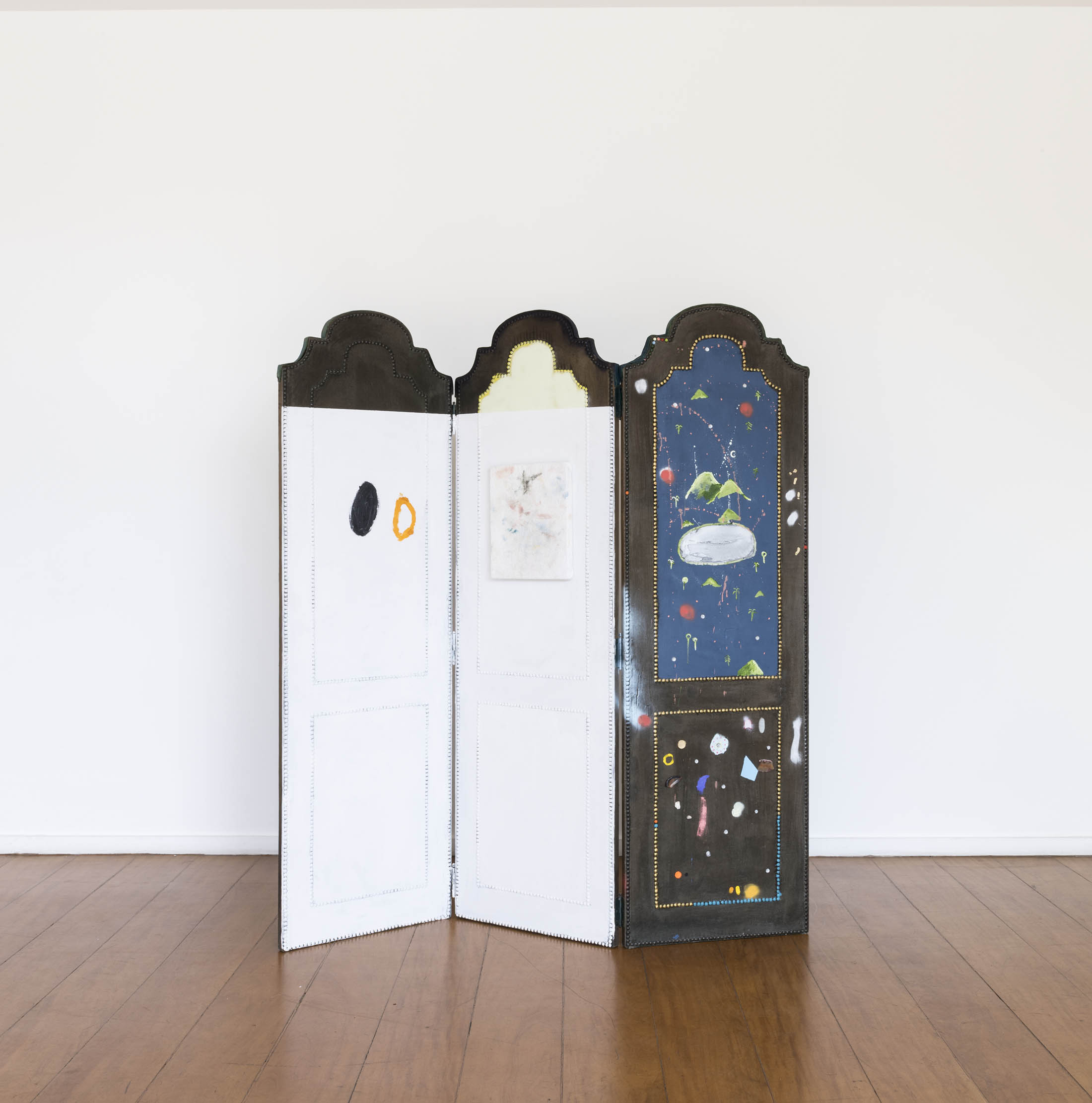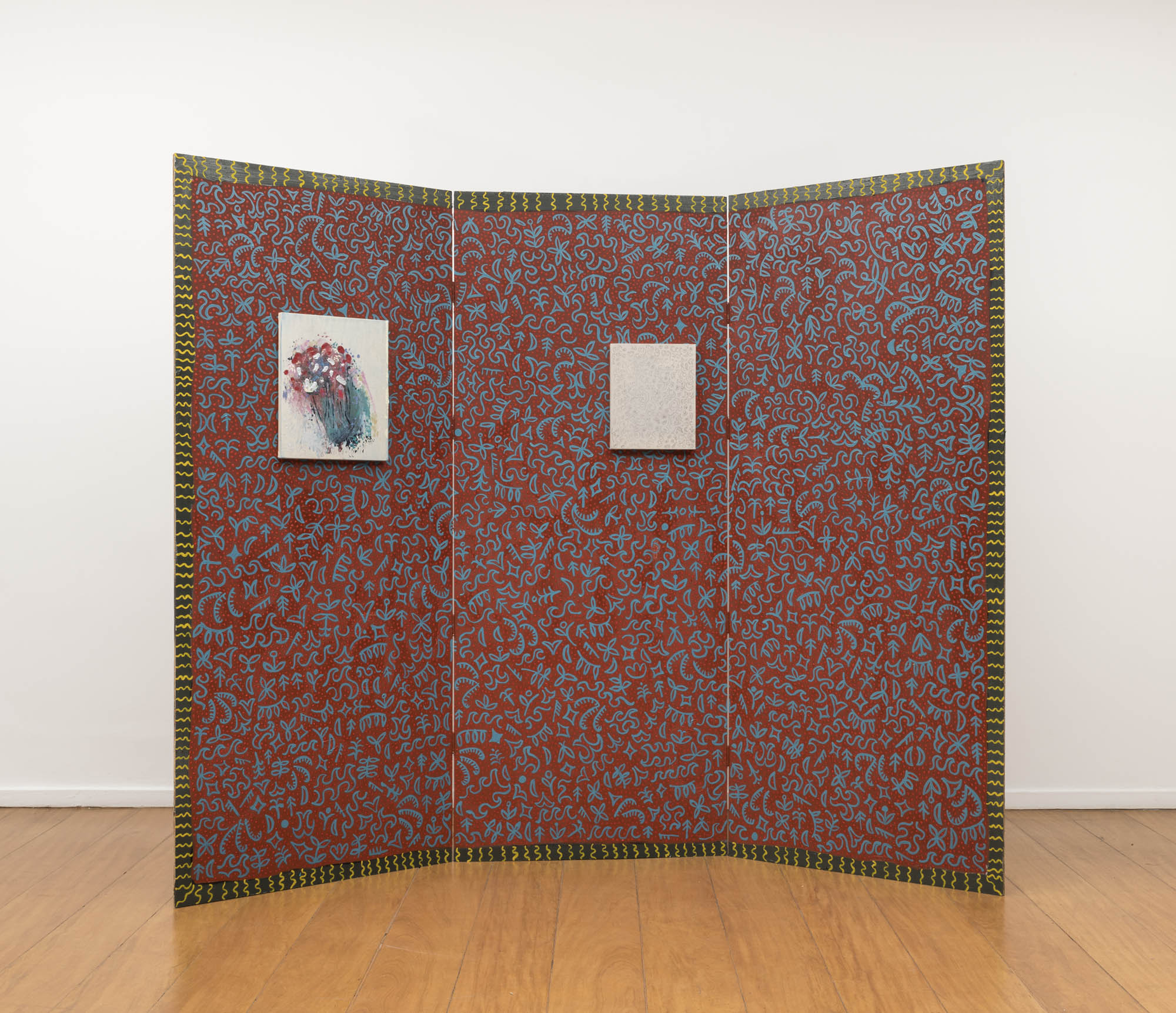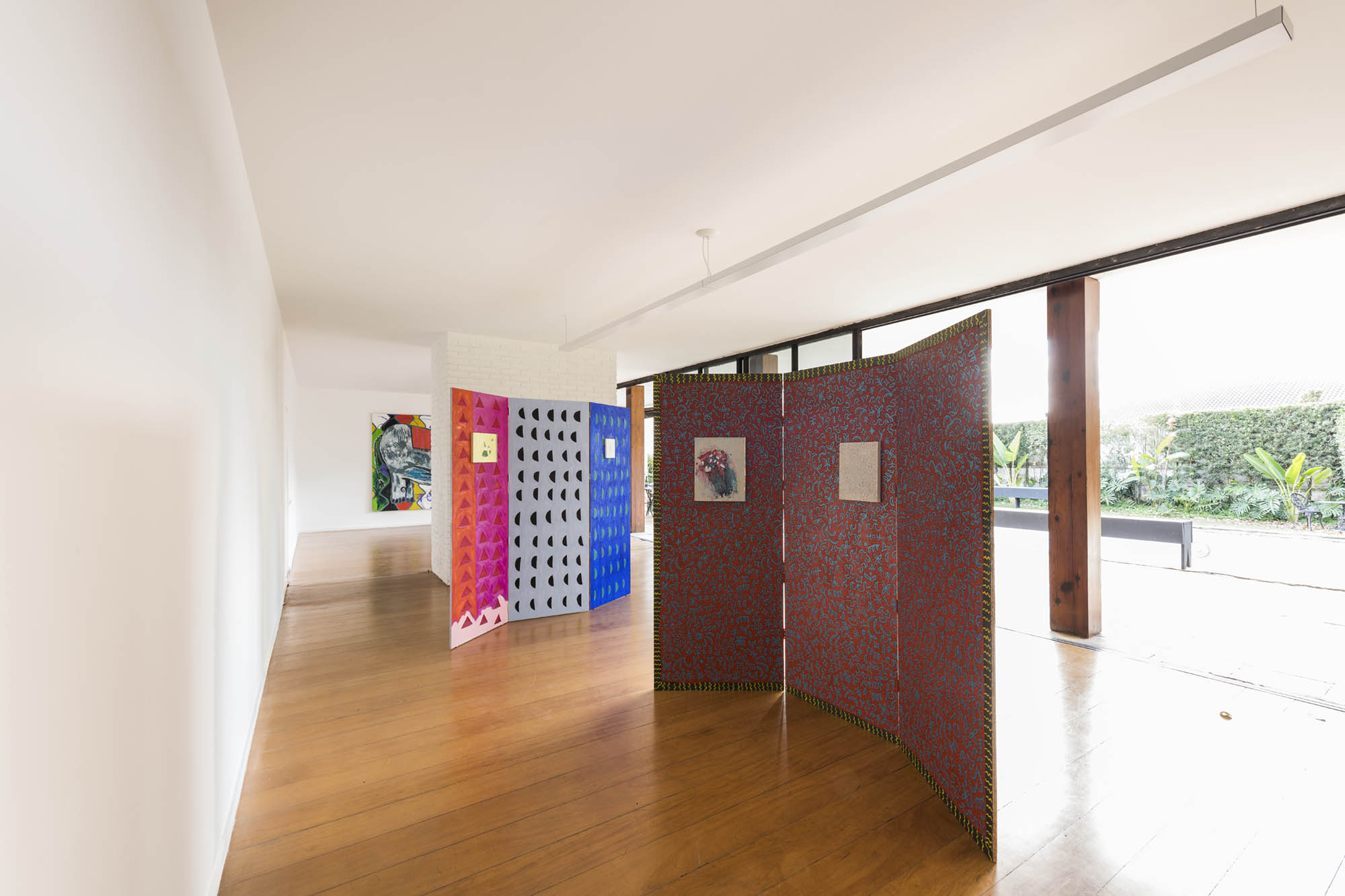 On the screens, Ana arranged small paintings; some with abstract patterns, others with figures, like a bouquet of flowers à la Redon or a wave à la Hokusai. Thus, it also puts the screens to act, assuming the role of support, false wall, a foldable and transportable wall, or a large screen on which not only she paints but also appends other paintings. Not by chance, it is like “folding screen” that the word “biombo” translates into English.