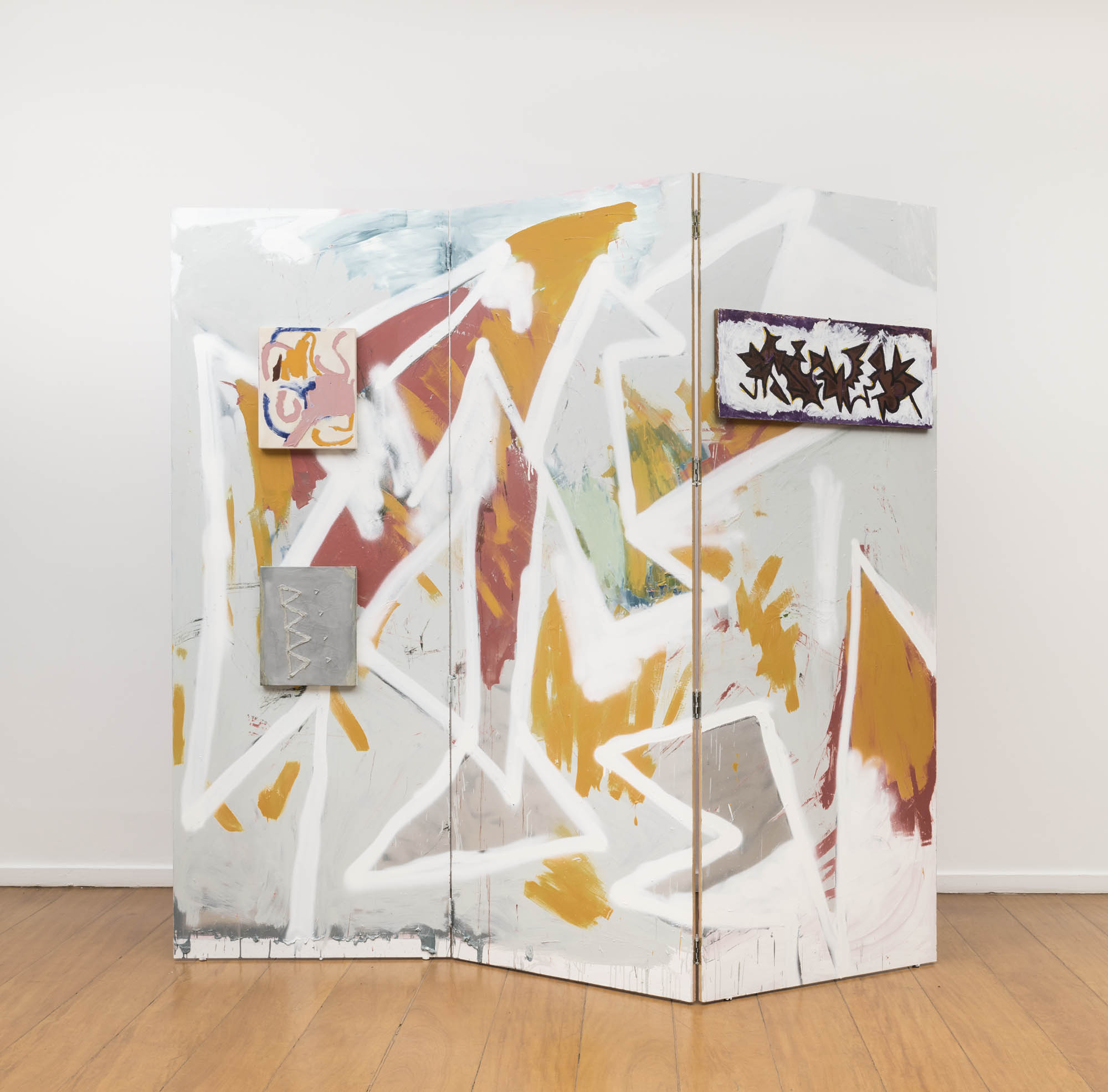 On the other hand, there are two recently made wooden screens: large, imposing, painted with oil and spray. They impose themselves in the exhibition environment, intruding into space. Since they are all composed of three sheets of wood, they could constitute themselves as triptychs – but Ana did not always want to do so. Only one of the screens has a tripartite structure on one of its faces, with a different painting for each of the three divisions, each painting produced from two dominant figures – the triangle for the first leaf, from left to right, and the half-light for the next two-that overlap with monochromatic backgrounds, or almost, in a game of contrasts: red versus pink, black versus gray, green versus blue. The resulting compositions remind us of Volpi, not only by the colors and organization of the geometric forms in space but also by the brushstroke that he does not want to hide. In the other paintings (the other