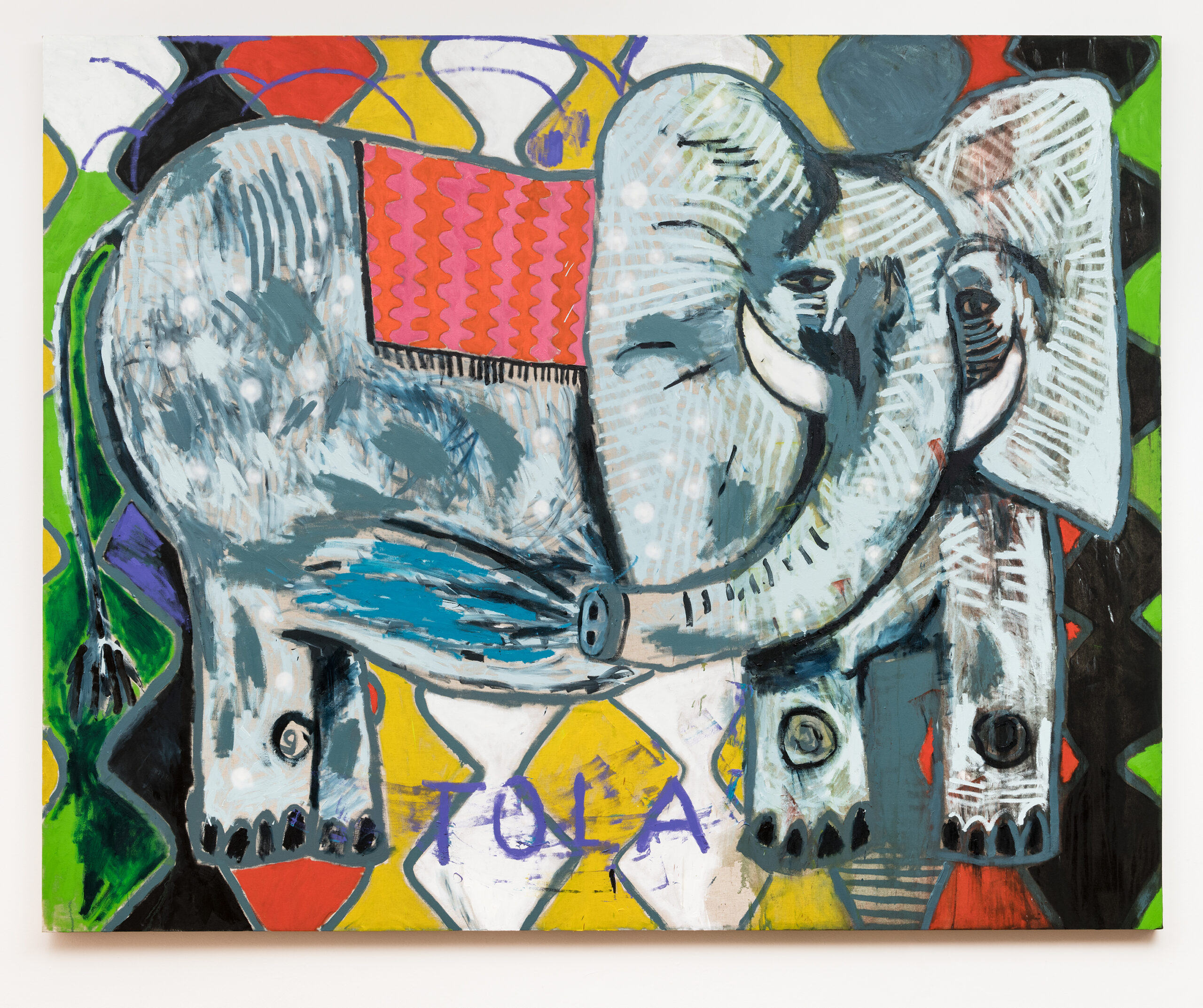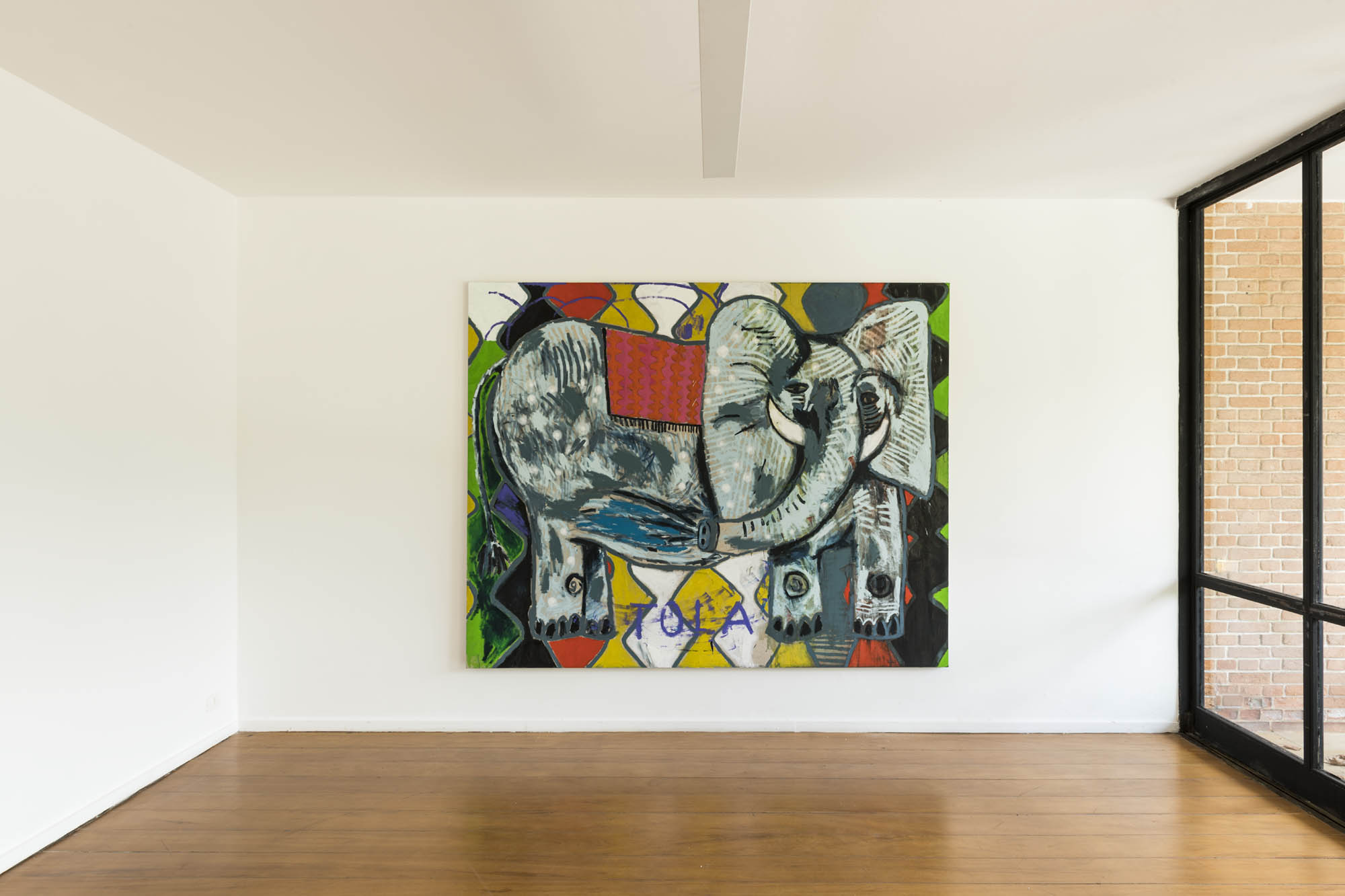 Finally, we can not forget that between one series and another, there is another “portrait”: no longer small and intimate, not drawn on paper, but an immense elephant – the figure par excellence of the circus mambembe – painted on linen even larger than the folding screens. Of all the portraits shown here, it is the only one that appears on a background that is not neutral. The animal hovers over a geometric composition that refers to the patterns found in the circus stalls or in the clothes of the mountebanks so often represented by Picasso. It is an image still gigantic like the screens, but now again two-dimensional – a two-dimensionality that, however, seems to arise precisely from the projection of the painting in three-dimensional structures through the folding screens. This elephant seems to function as an allegorical configuration not only of the tensions that organize this exhibition (the main one being the relationship between screens and portraits, which is, in the last instance, a new way of revisiting the question between figure and background, central to modern and contemporary painting), but also of a procedure dear to Ana Prata, a certain elephantiasis that usually guide the way she deals with the artists with whom she dialogues: by incorporating elements and figures from other people’s works, she almost always enlarges them. This is what happens with the Klee already mentioned, with the Picasso of a folding screen exposed in the Gallery of the Lake of the Palace of the Catete (in Rio de Janeiro) – or even, here, of the folding screens, so to the taste of Matisse: in Prata’s work, they really transform themselves into folding screens. The screens allow us to realize that enlargement is the first step for such elements to take shape – and, detached from the wall, making themselves as walls, in a confusion between being wall or work, come to exist more clearly in space. Prata’s screens are like a fortelling of living beings that the works at once want to be – and know not to be. Situated at the end of this exhibition, the elephant, with its huge body, huge ears and trunk with its own life, seems, not by chance, to be another screen between screens, a folding and pictorial animal, so related to that other elephant , “imposing and fragile,” which Drummond saw disassemble and reassemble itself day after day.