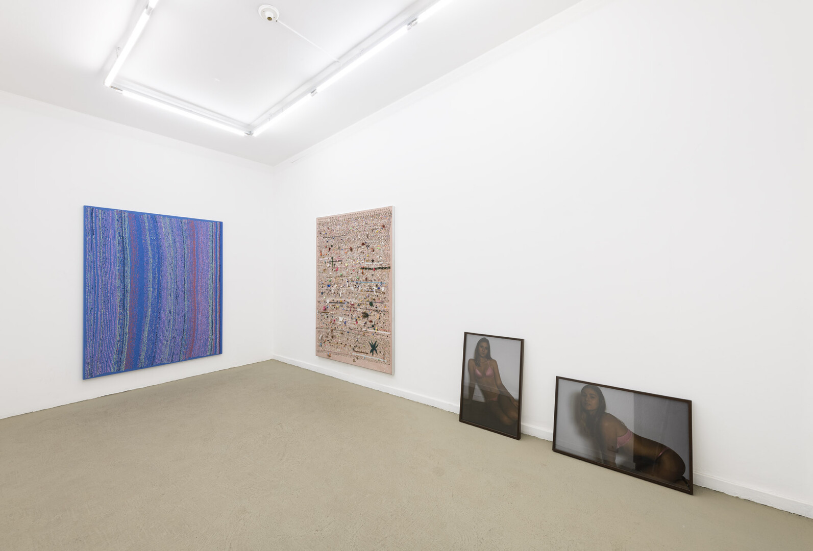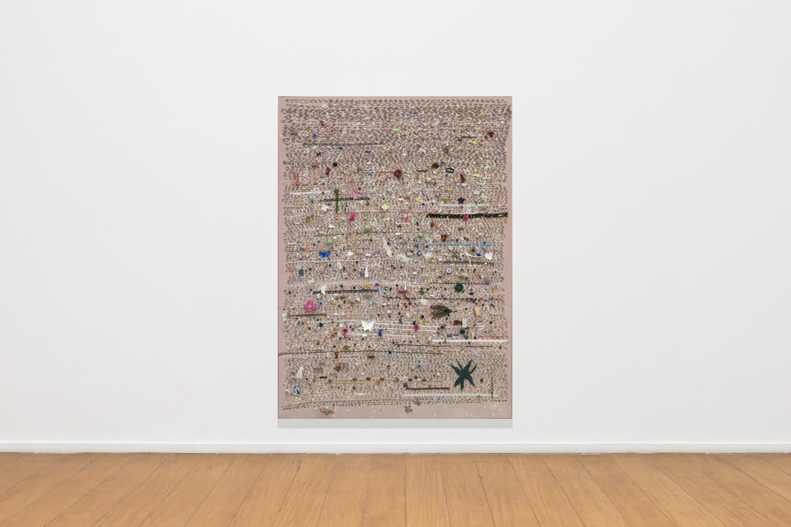 There are aspects that refer to a teenage aesthetic in these works. Be it the strong colors – almost fluorescent in some of her beadworks – or the two self-portraits that show the discomfort of the artist’s self-sexualization in the transition to her adult life; but also for the materials that the artist collects and uses in her “untitled” work that refer to this universe. There are trinkets, bibelots, an iPod (which in itself marks a time frame, who knows what songs are in there) and all sorts of things that could be found on the desk in a teenager’s room from the early 2000s. The works operate within logics of superficiality, that is, things happen on the surface: in the reflection of the glass of very dark photographs; otherwise, in the direct and flat manner of “exotic juxtaposition of rich and poor”; or even in the slow and constant filling, full of errors and improvisation that constitutes the beadworks.