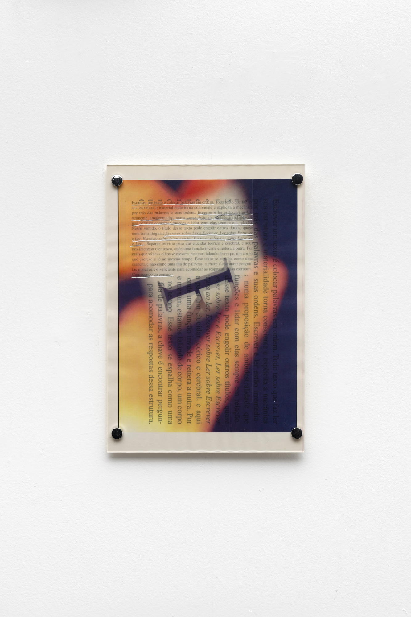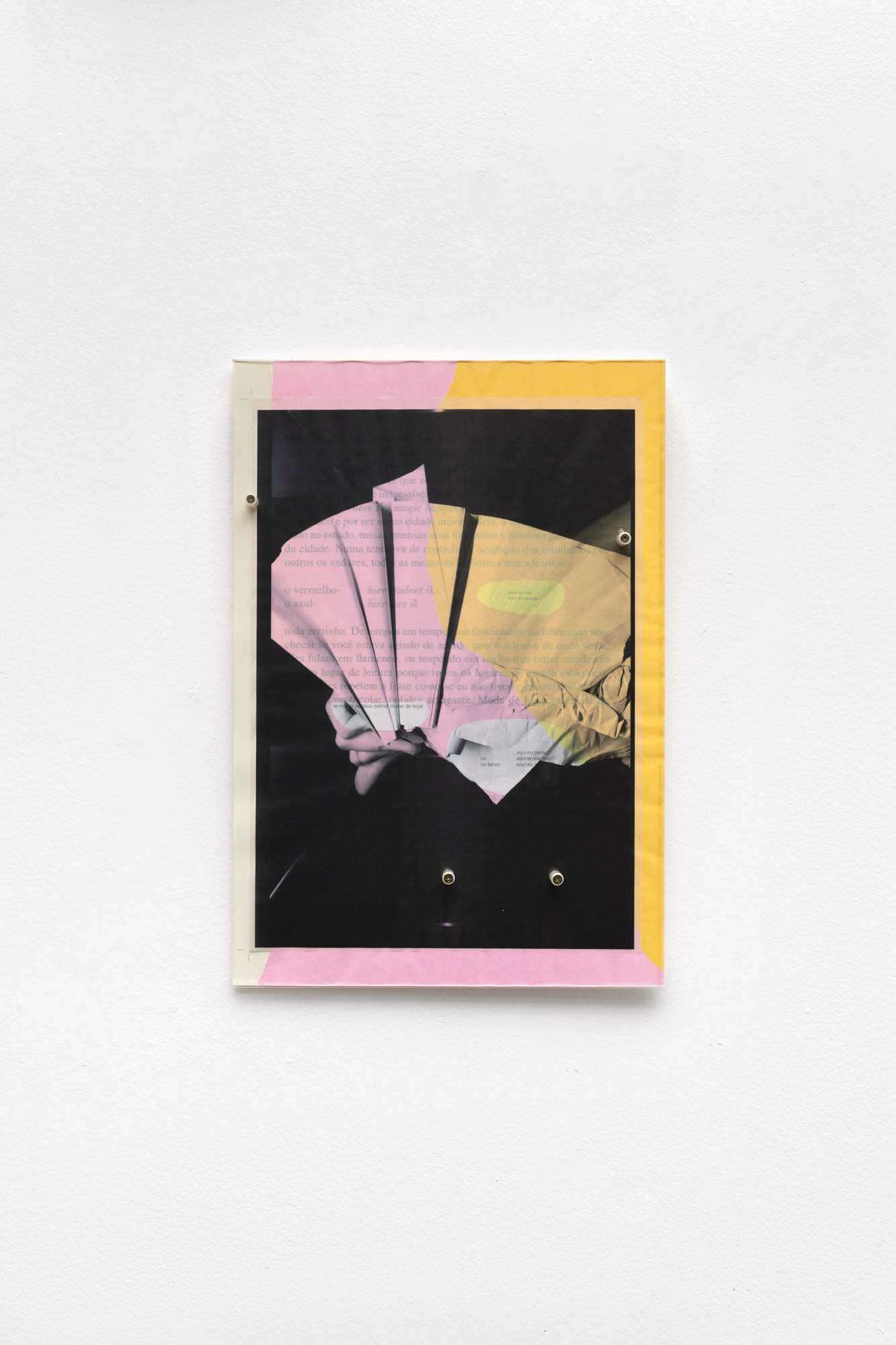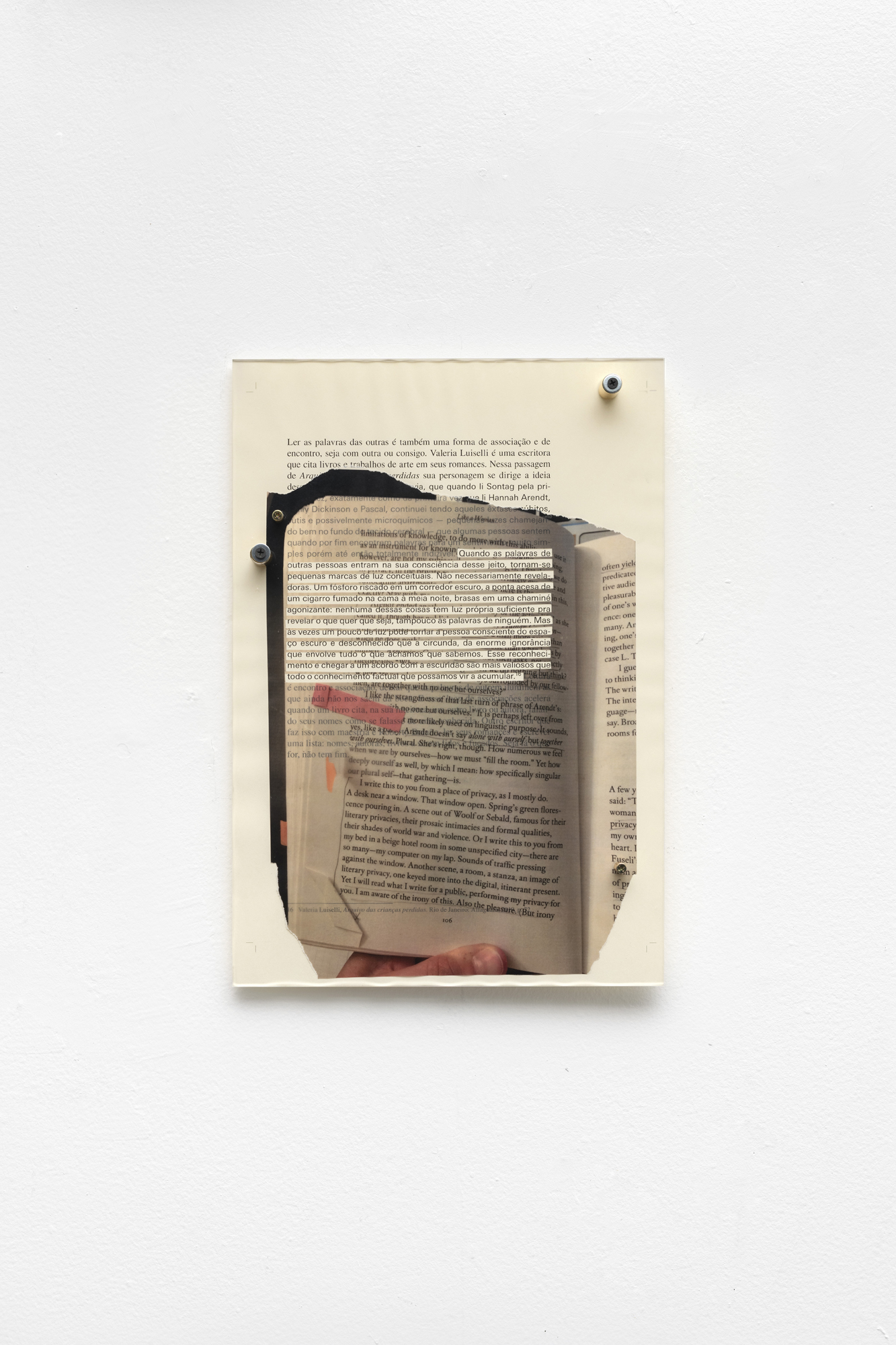 In this exhibition, 11 chapters of the series are assembled between acrylic pieces fixed with metal, where these elements of preservation and support are incorporated into the work. For the installation in the auroras library space, the artist created metallic supports that draw in space, giving an installation layer that amplifies the fictional between the physical space of the library and the reflective space evoked by the artist in the series of collages. Both in this installation gesture and in the dynamics of forces within each collage, space, support and montage seem to be incorporated into the dynamics of work force, also behaving as a field of language.