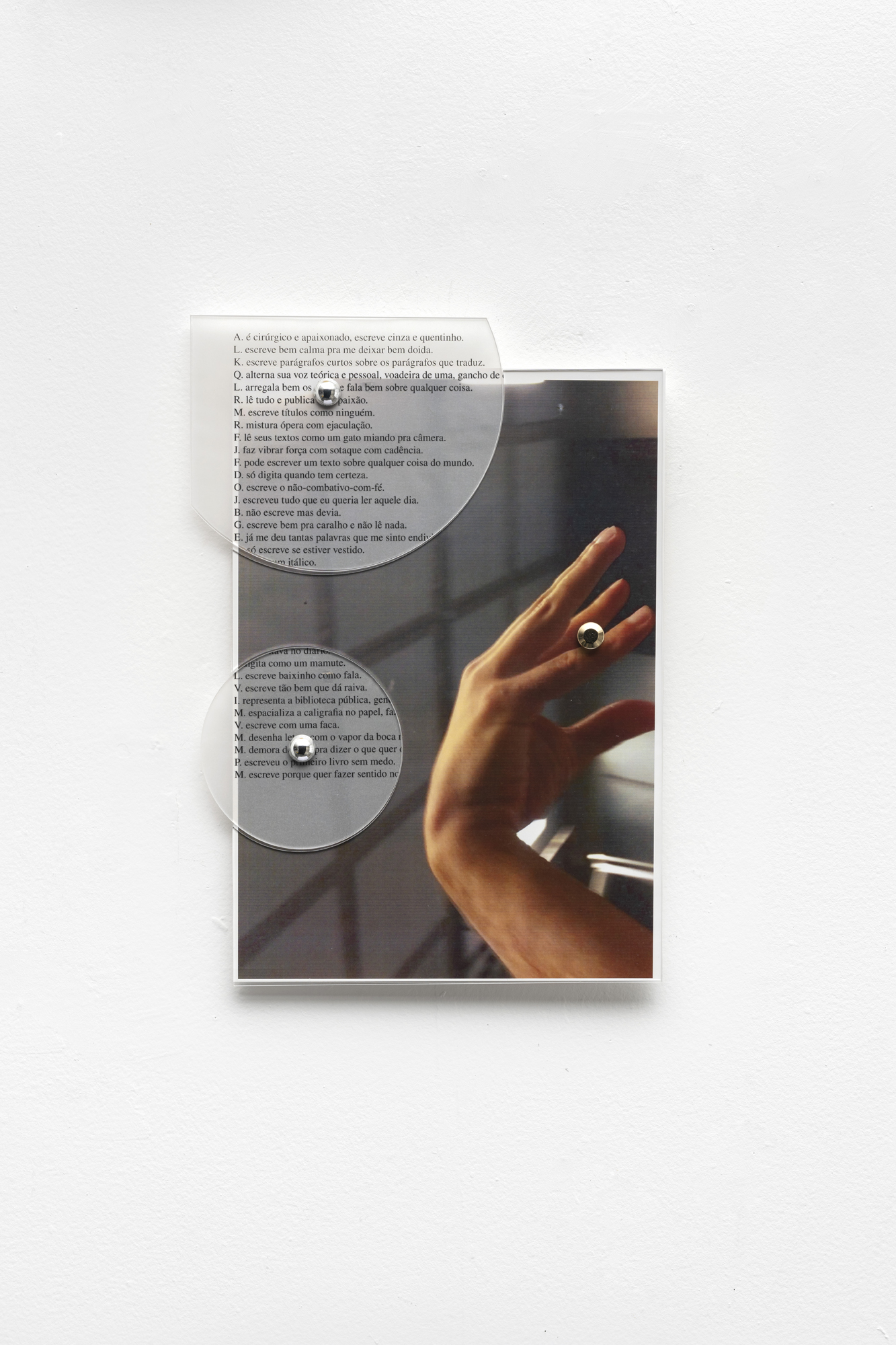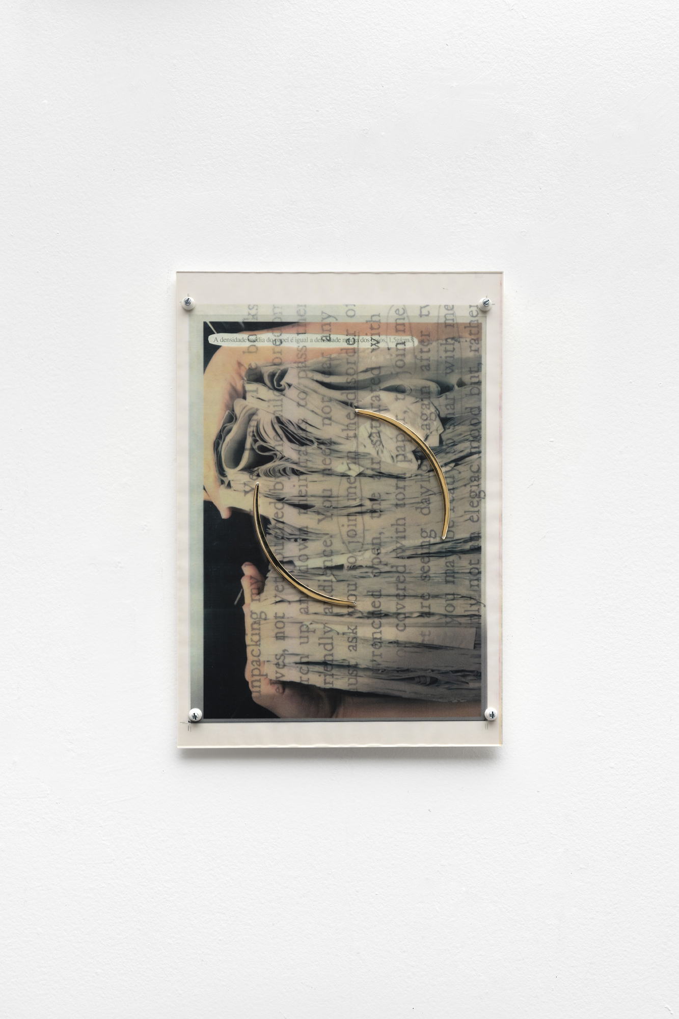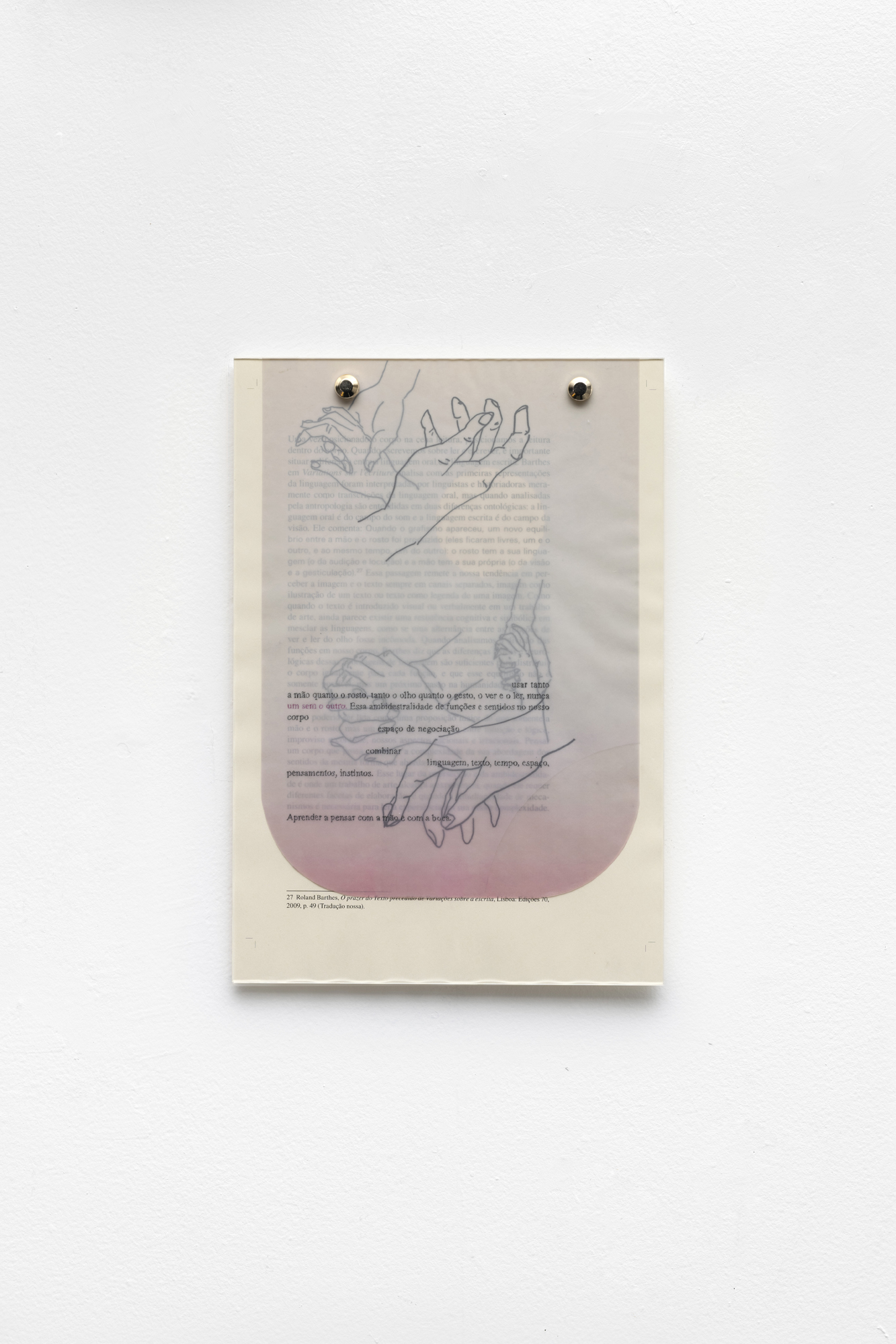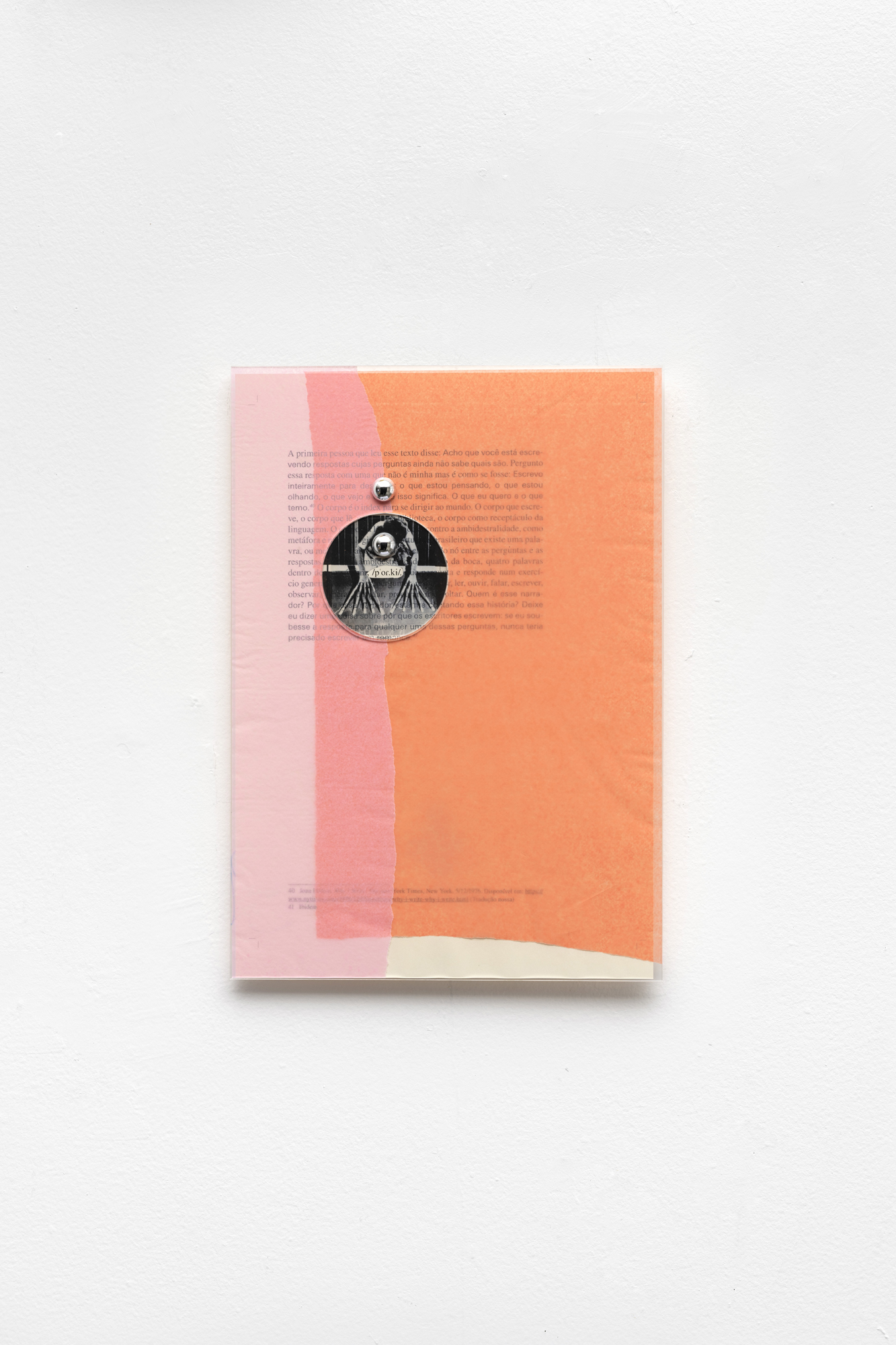 In this exhibition, 11 chapters of the series are assembled between acrylic pieces fixed with metal, where these elements of preservation and support are incorporated into the work. For the installation in the auroras library space, the artist created metallic supports that draw in space, giving an installation layer that amplifies the fictional between the physical space of the library and the reflective space evoked by the artist in the series of collages. Both in this installation gesture and in the dynamics of forces within each collage, space, support and montage seem to be incorporated into the dynamics of work force, also behaving as a field of language.