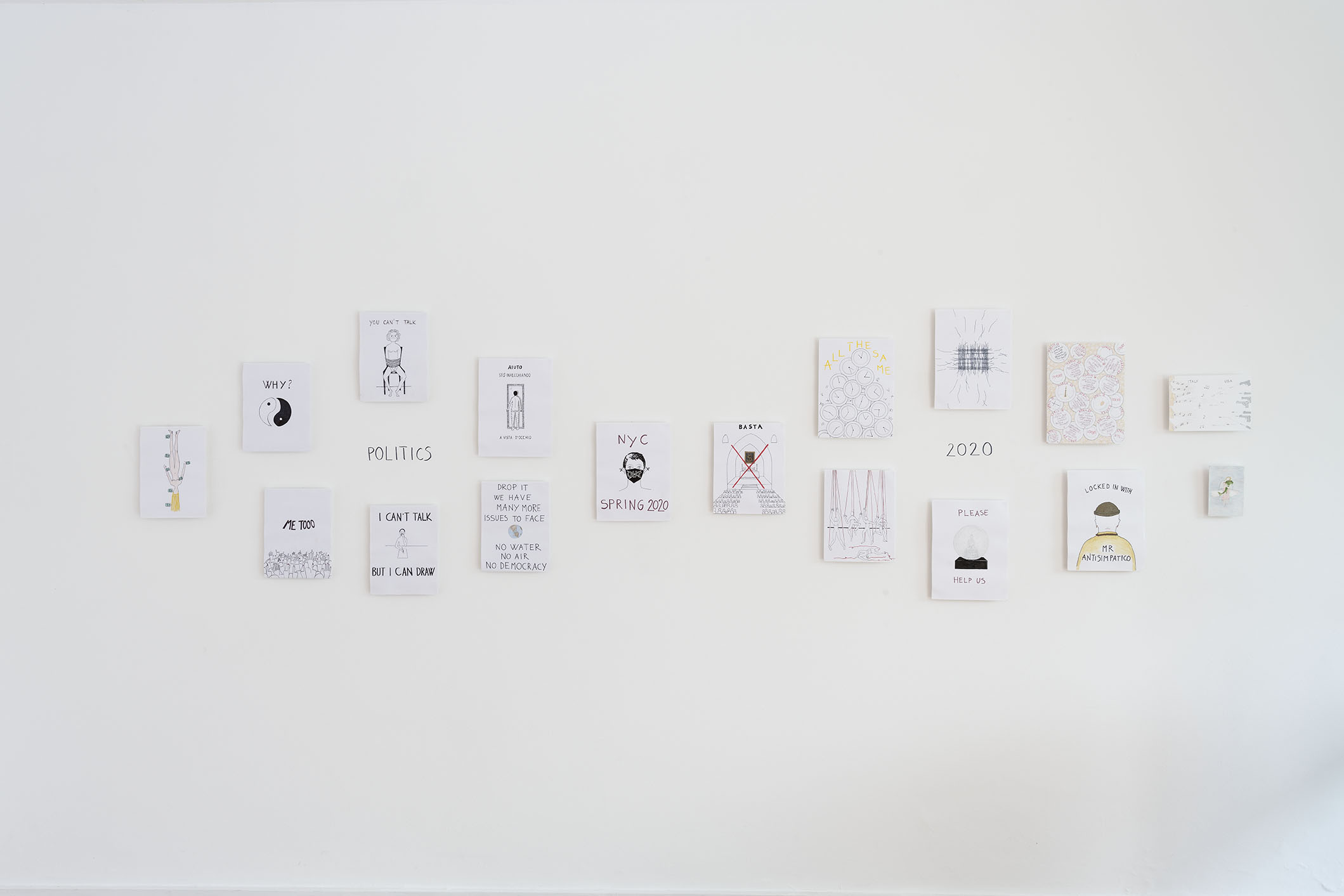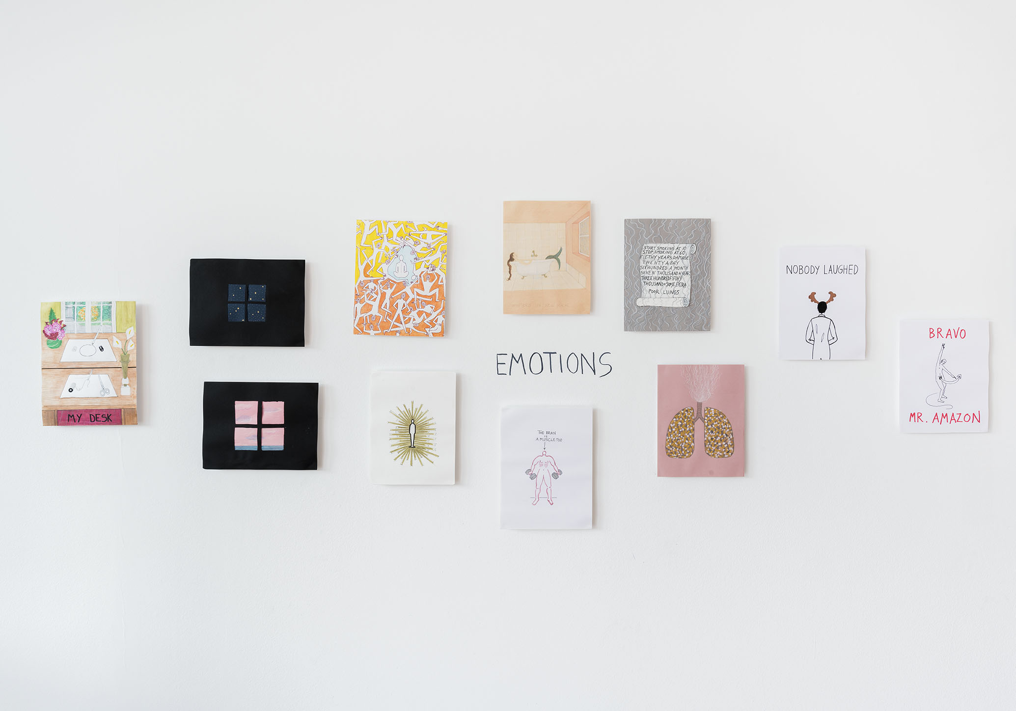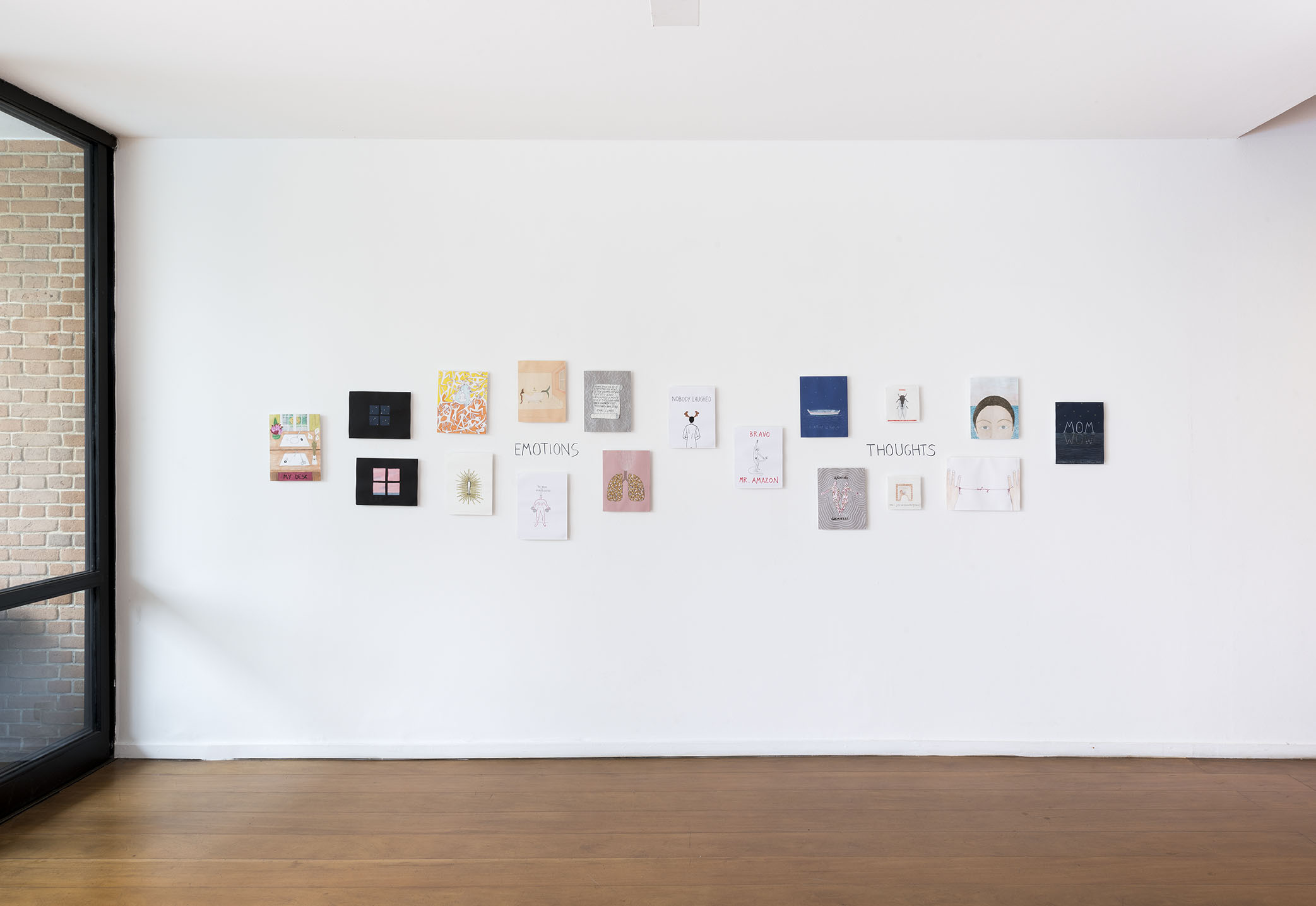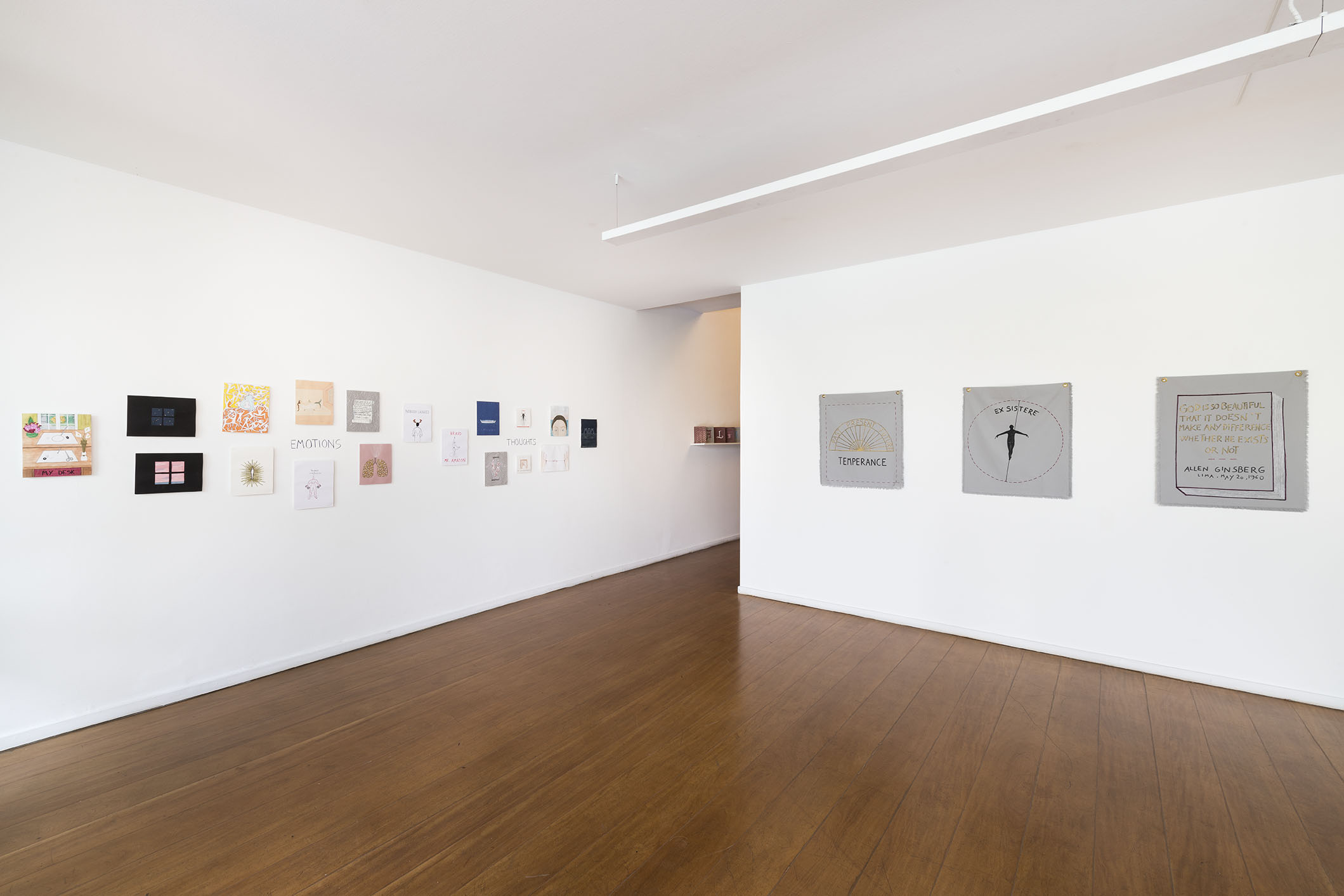 O espaço principal é dedicado a uma série de desenhos em papel e tecido publicados recentemente em seu livro “A Clear Mind” [Uma Mente Clara]. O livro é uma chave e um mapa da eclética experiência de vida de Alba Clemente e está dividido em cinco partes: memórias, pensamentos, emoções, política e fantasias. Todos esses temas estão representados em seus desenhos espirituosos e surpreendentes.