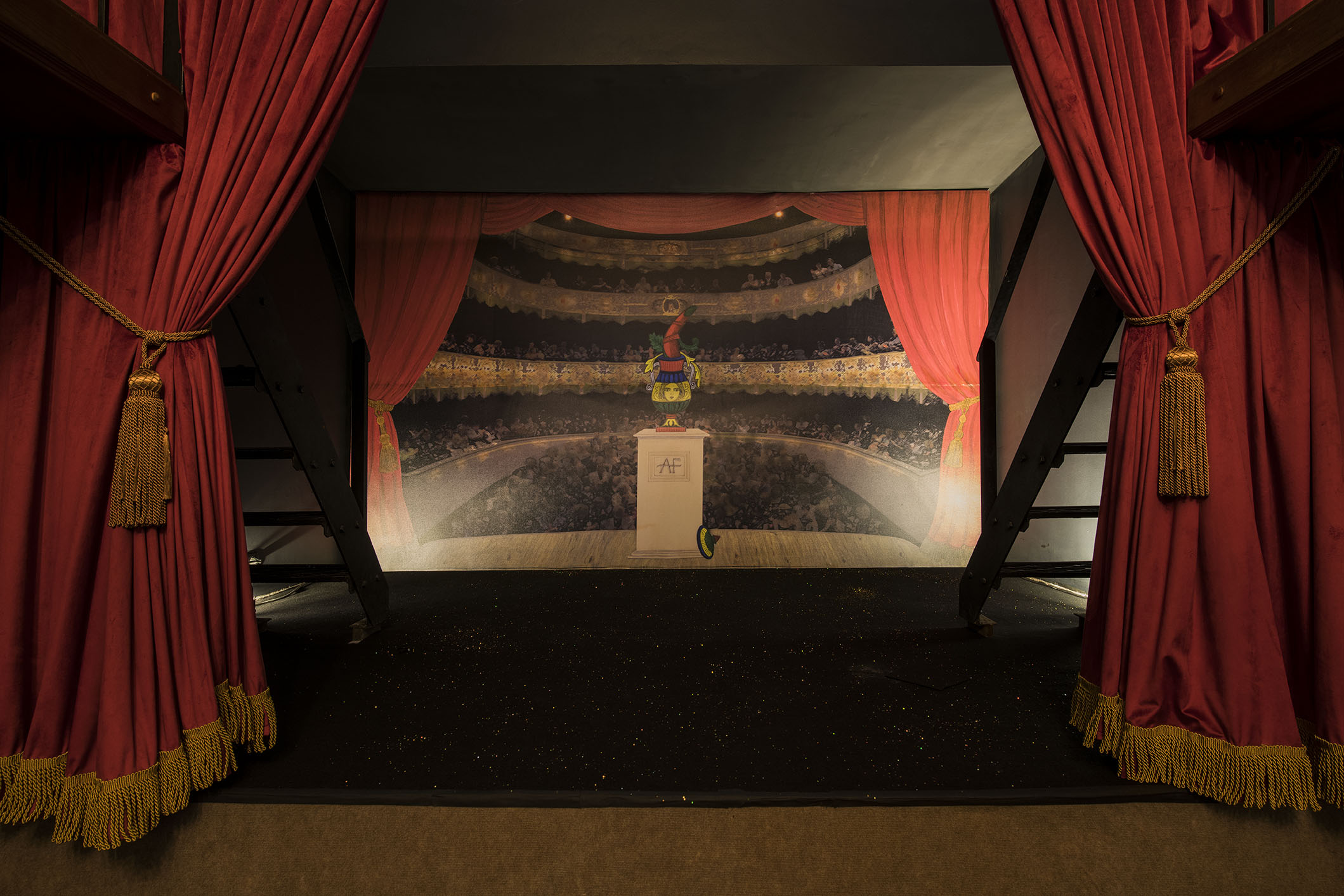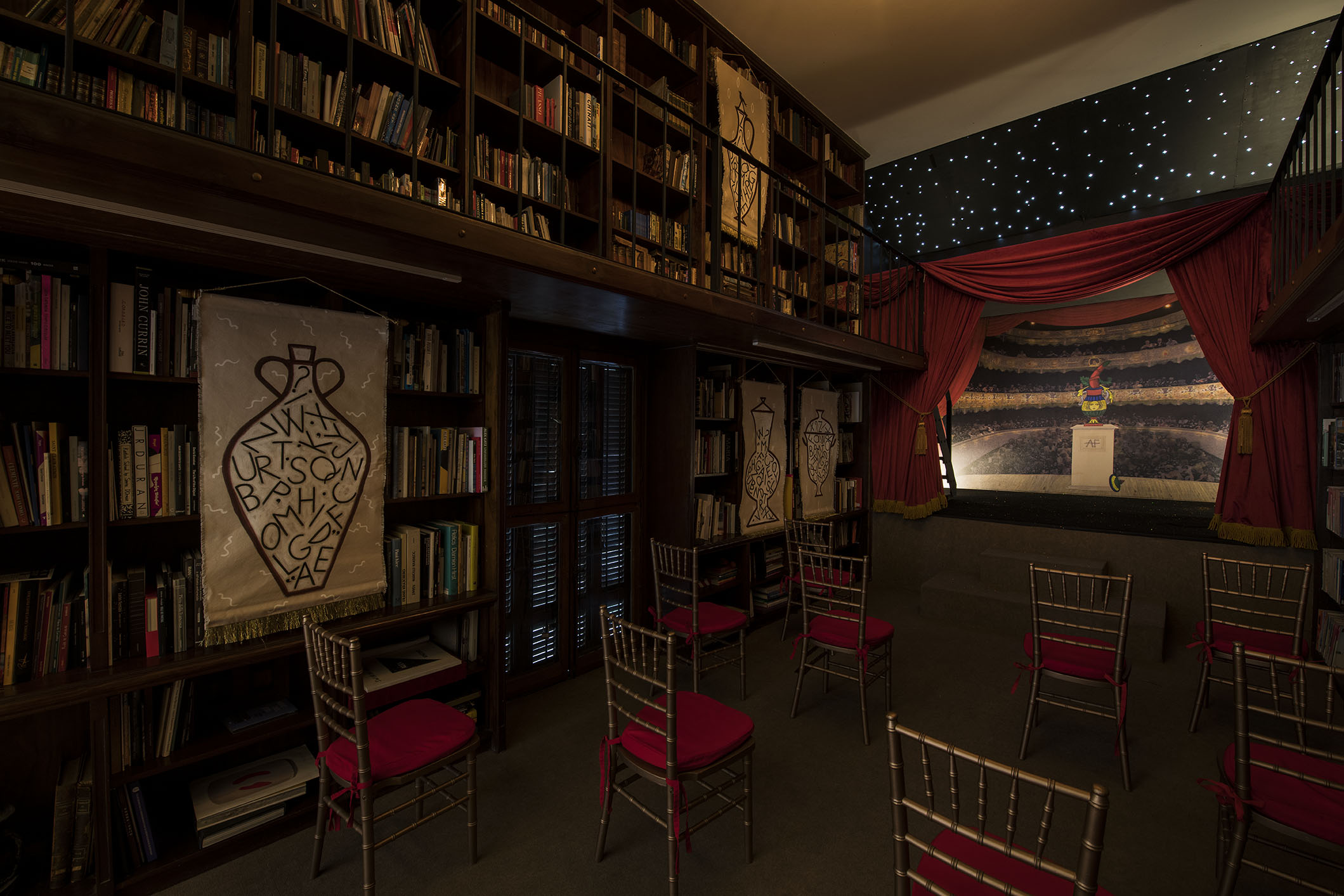 O objeto central da exposição é uma instalação na biblioteca onde a artista recria um pequeno teatro que construiu em Greenpoint, Brooklyn. O pano de fundo é uma imagem do Teatro Asolo (Treviso, IT, 1798), sobreposta por um desenho de duas cartas de Tarô, imagem que simboliza ela e o seu marido como um só. Na reprodução em miniatura deste teatro feita por Alba, o espectador é colocado em um lugar imaginário, onde a visão do ator e a visão do público se sobrepõem.