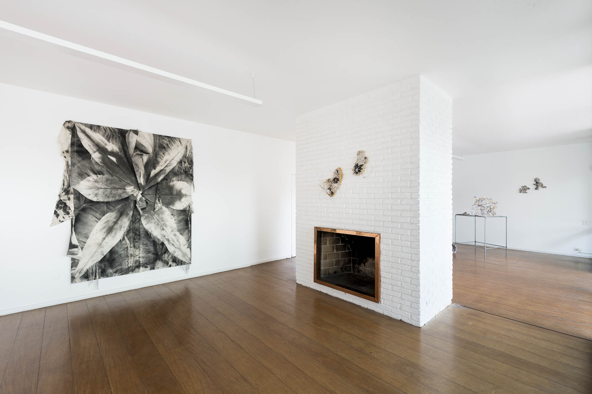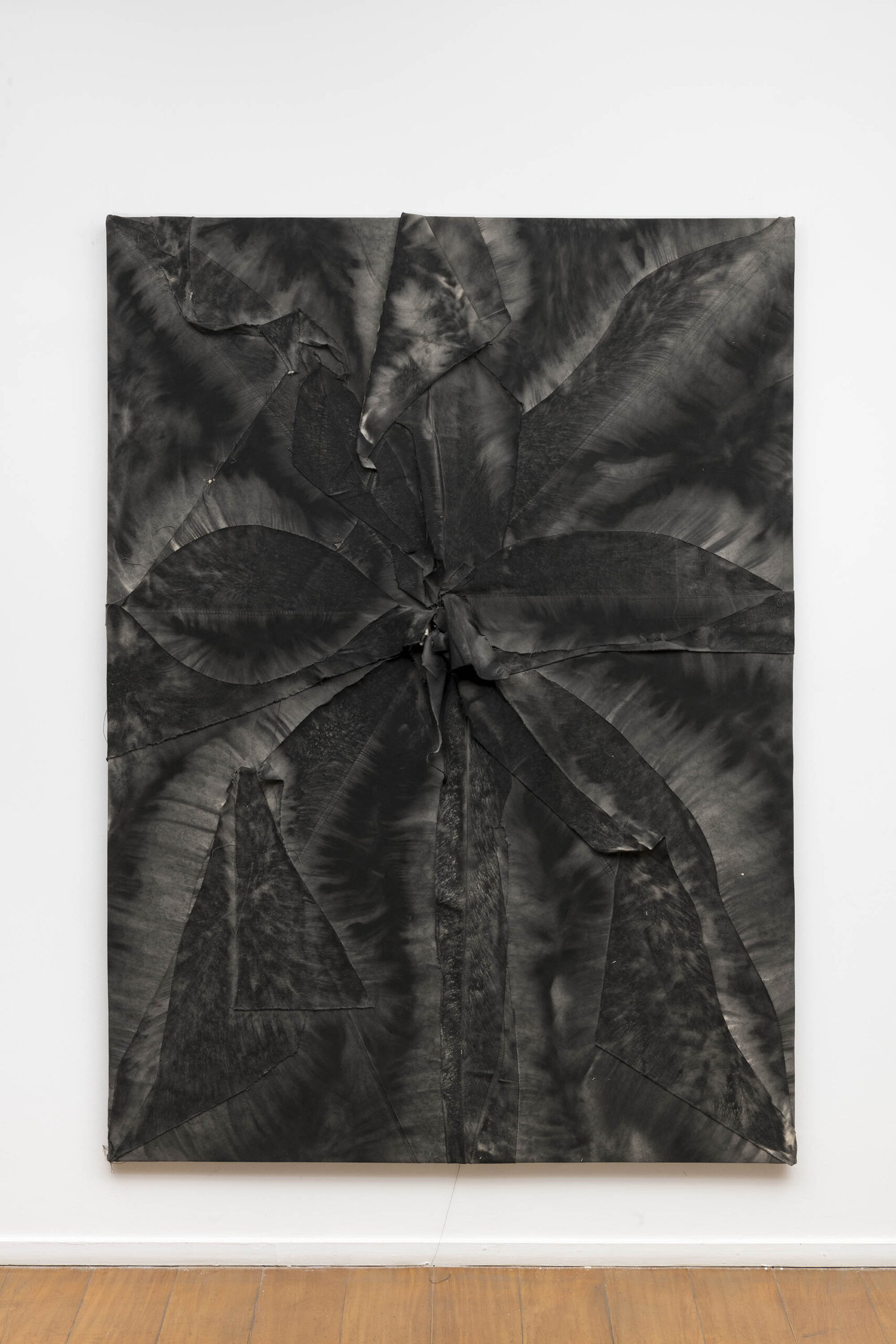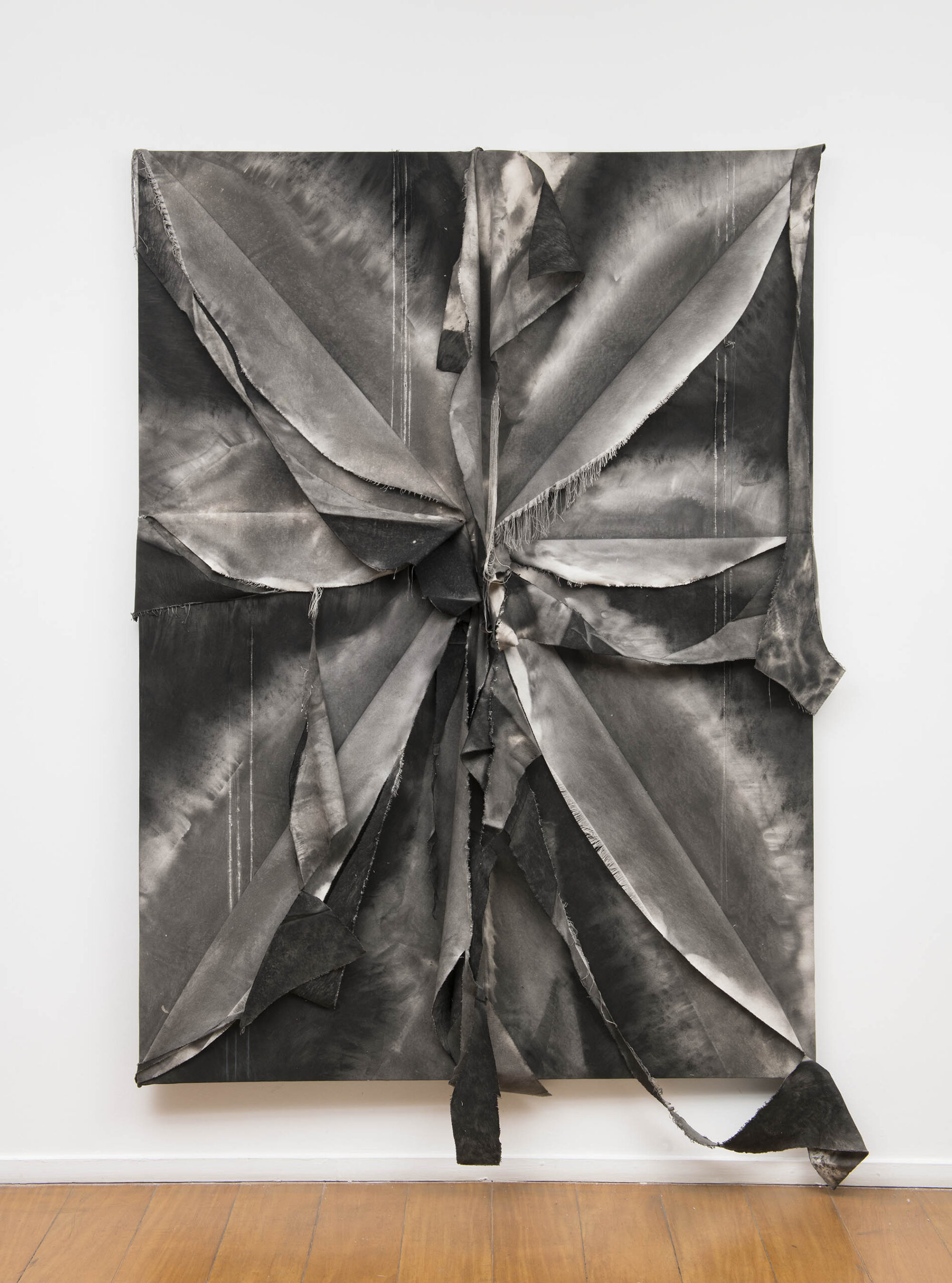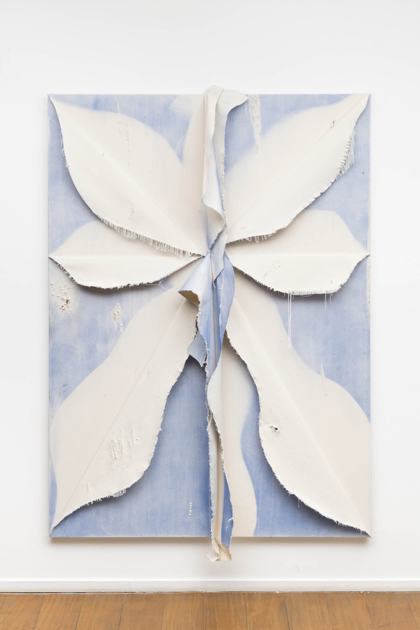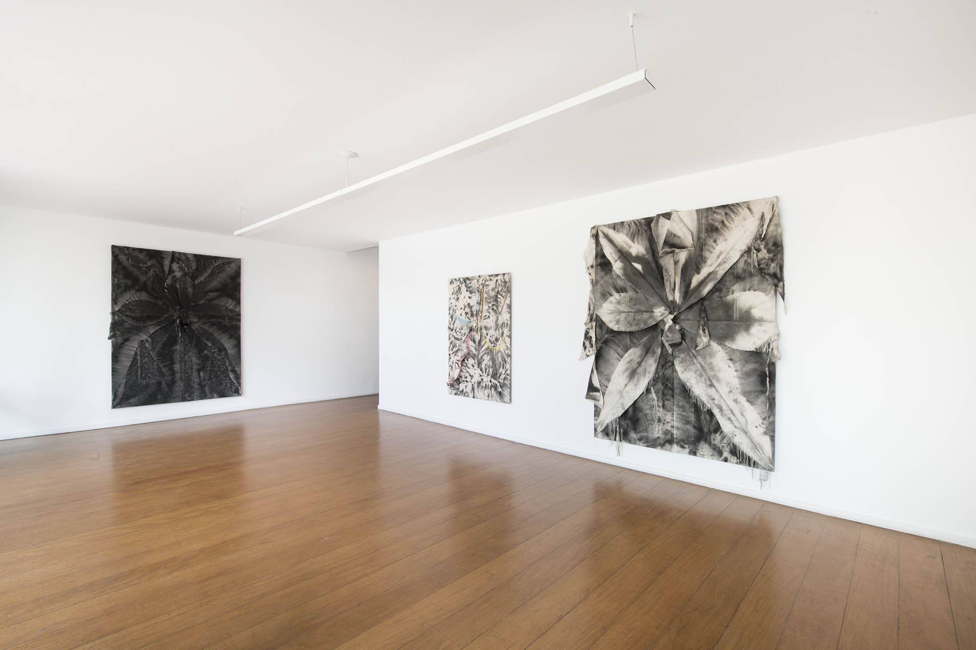 De outra maneira, as pinturas de Tiago Tebet também partem de gestos de ruptura e sutura. Em suas novas obras, o processo parte da conjunção de telas rasgadas que são reorganizadas sobre a superfície. Desse ponto inicial, que impõe uma série de desafios para a composição pictórica (uma vez que tumultua o plano de ação), o artista passa a compor intuitivamente. Esse procedimento foi iniciado por uma vontade de rompimento com o conjunto de trabalhos anteriores – mais objetivos e afirmativos em seus signos e gestos – literalmente rasgando partes dessas pinturas para florescerem novos caminhos. Depois de um intenso período de experimentação com a linguagem, como é recorrente na obra de Tebet, essa sugestão figurativa de flores com telas cruas começou a se tornar um elemento de interesse para composições mais soltas e plasticamente sensíveis.
