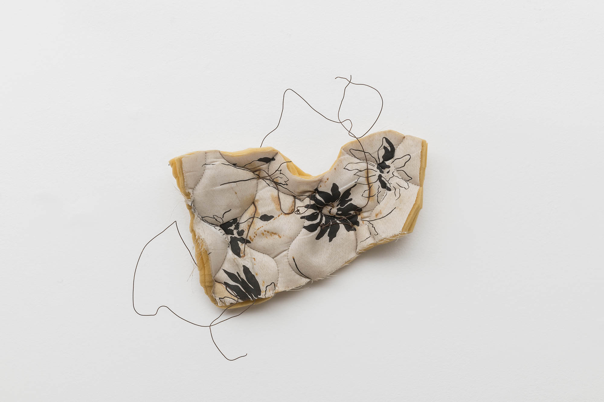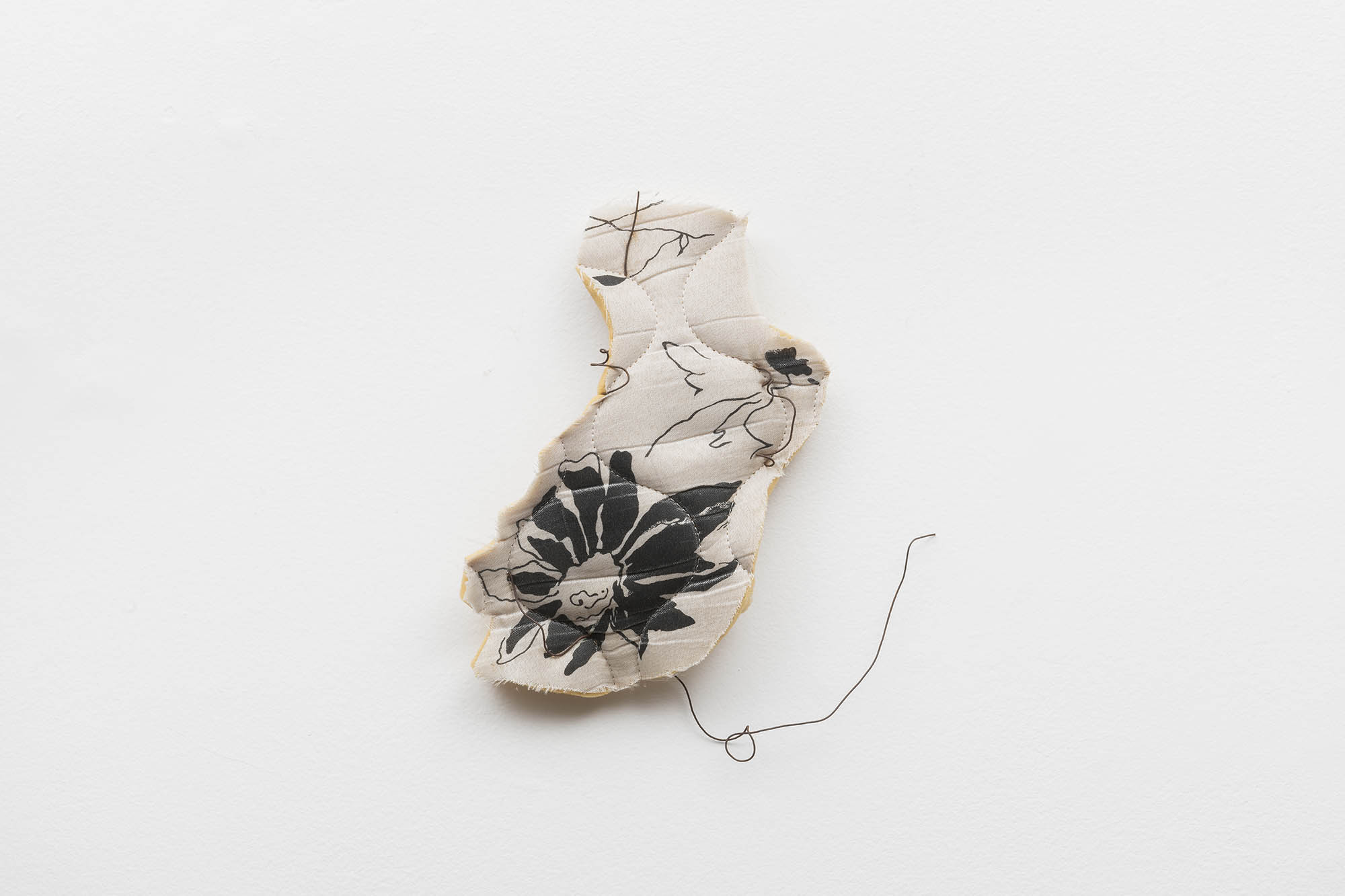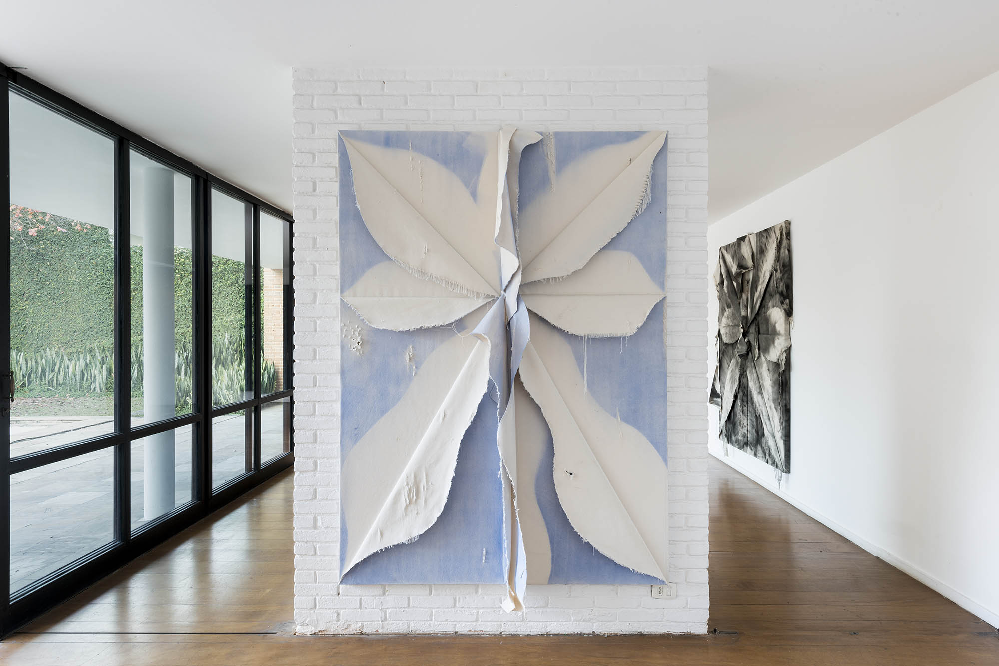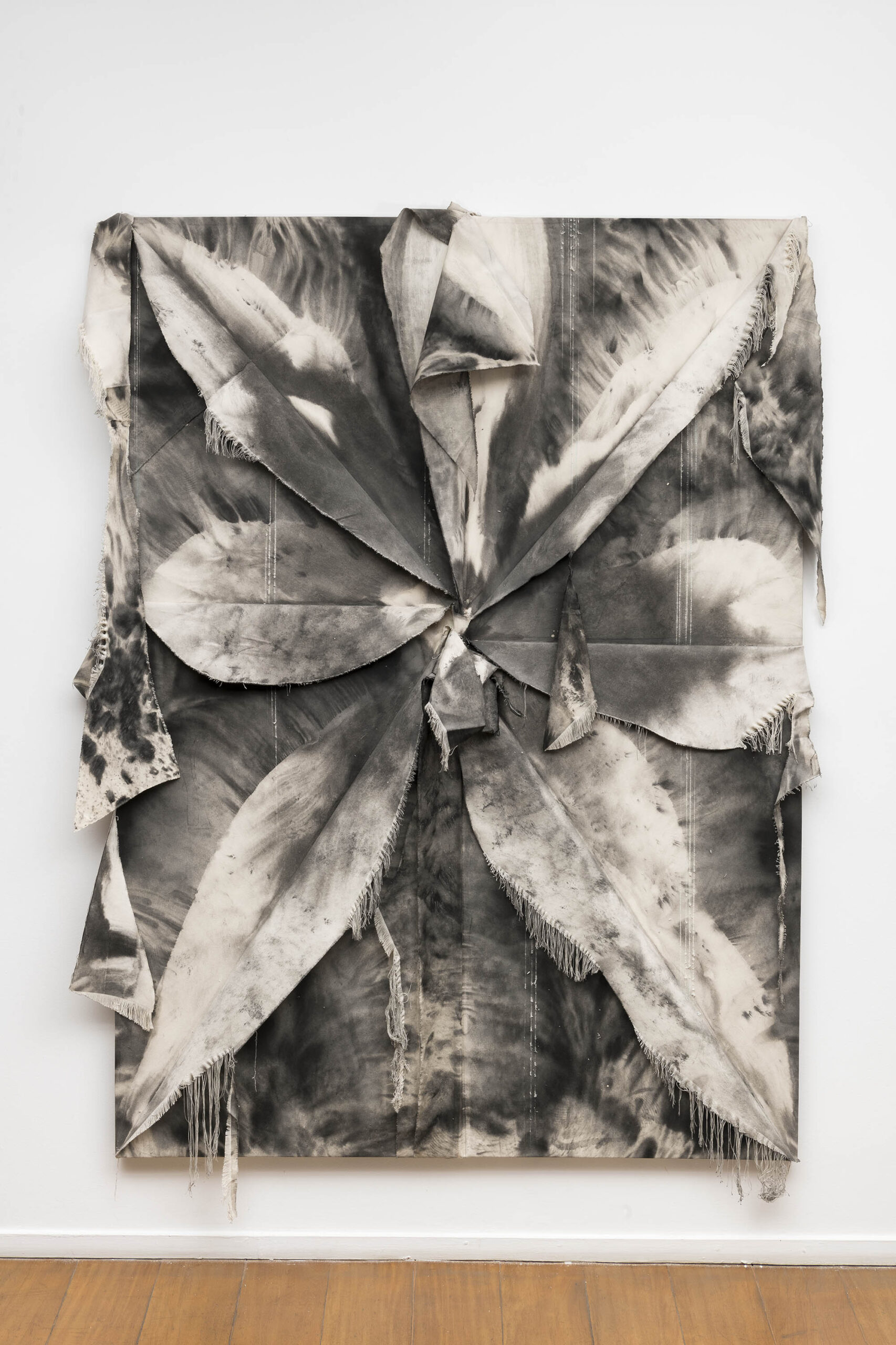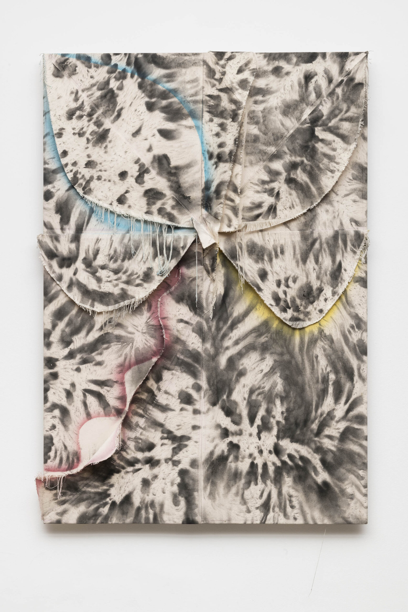De outra maneira, as pinturas de Tiago Tebet também partem de gestos de ruptura e sutura. Em suas novas obras, o processo parte da conjunção de telas rasgadas que são reorganizadas sobre a superfície. Desse ponto inicial, que impõe uma série de desafios para a composição pictórica (uma vez que tumultua o plano de ação), o artista passa a compor intuitivamente. Esse procedimento foi iniciado por uma vontade de rompimento com o conjunto de trabalhos anteriores – mais objetivos e afirmativos em seus signos e gestos – literalmente rasgando partes dessas pinturas para florescerem novos caminhos. Depois de um intenso período de experimentação com a linguagem, como é recorrente na obra de Tebet, essa sugestão figurativa de flores com telas cruas começou a se tornar um elemento de interesse para composições mais soltas e plasticamente sensíveis.