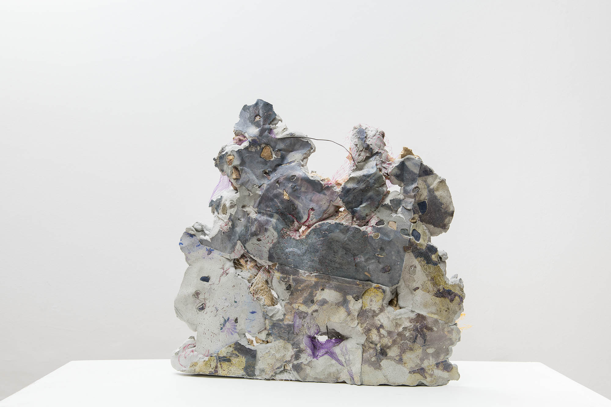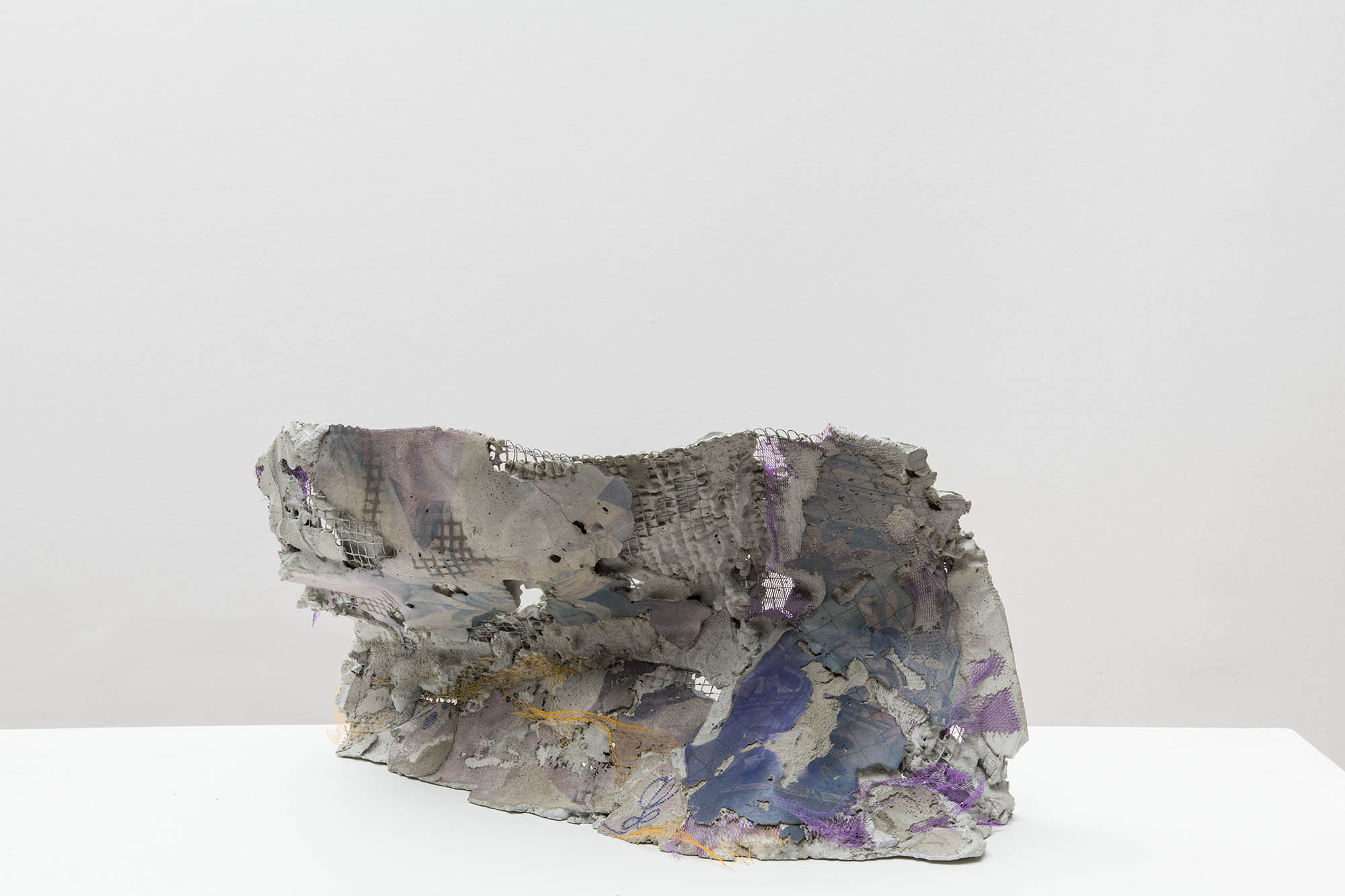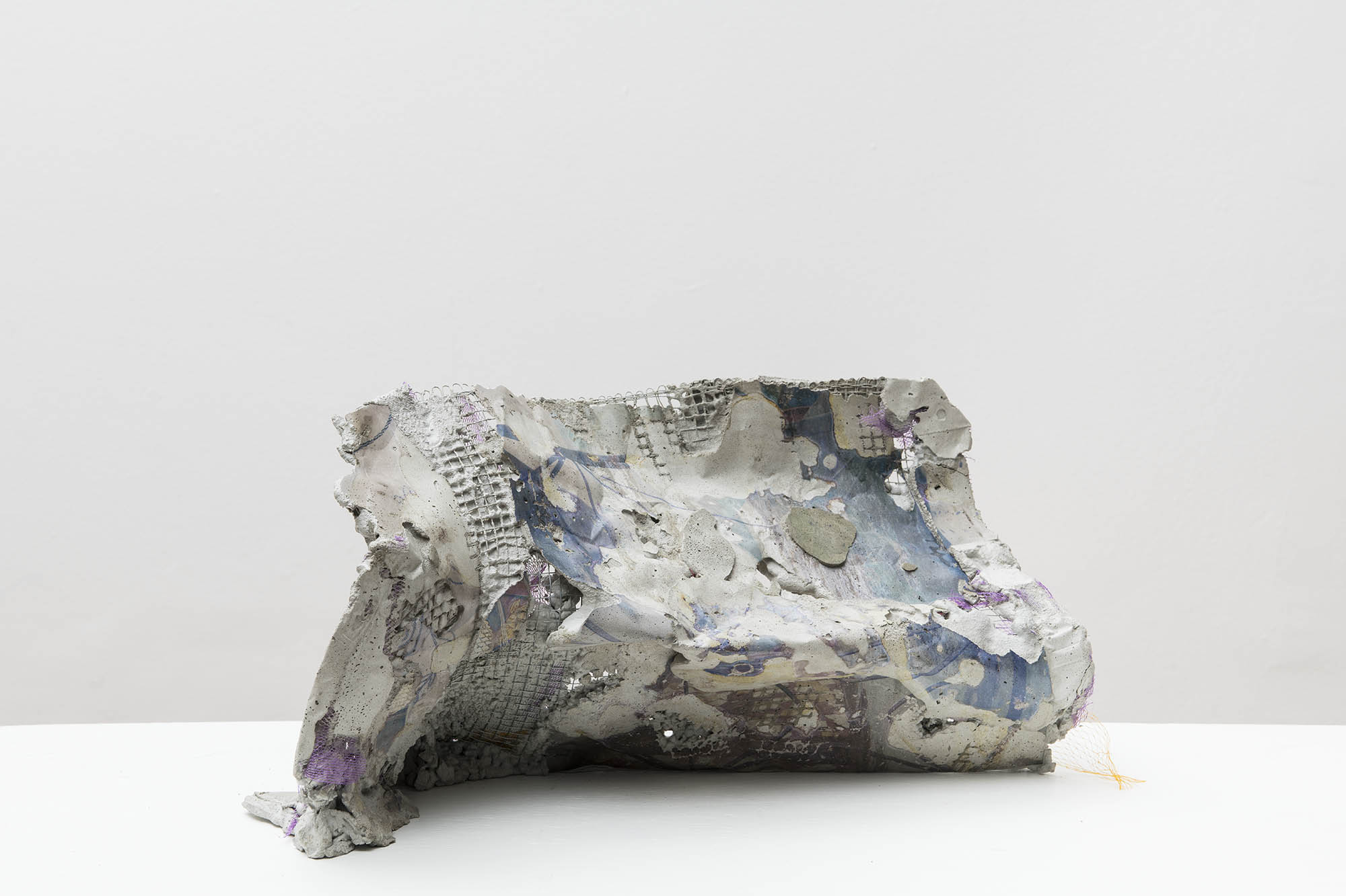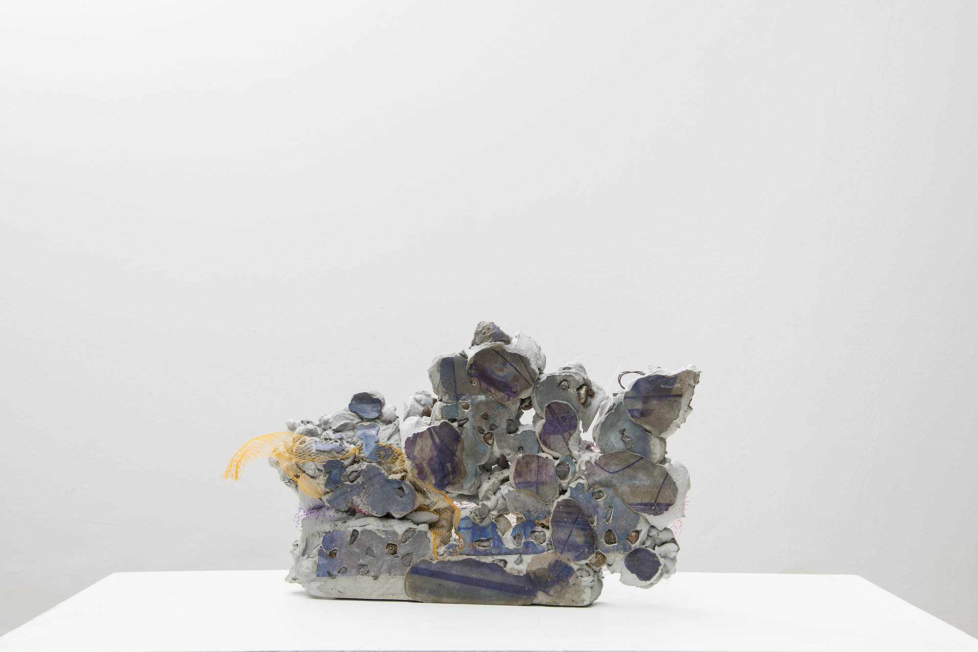 O conjunto de “foto-esculturas” que Ana Clara Tito mostra no auroras são formados por blocos de concreto com impressões fotográficas por transferência. O acervo fotográfico da artista acrescenta à essas novas obras, mais do que imagens, um espectro cromático de tons azulados e púrpura, resultado da transferência de tinta do papel para o concreto. Poderíamos contrapor esse acervo pessoal – que por fim revela-se muito pouco – com a crueza dos destroços de concreto, ruína de um projeto de construção. Elementos estruturais, como vergalhões e pedras, aparecem das entranhas desses objetos, misturados ainda não com redes de proteção da construção civil, mas com redes de vegetais de feira, aproximando novamente dois universos distintos. Grande parte das obras foram realizadas este ano durante sua residência na Fundação Armando Alvares Penteado (FAAP), em São Paulo.