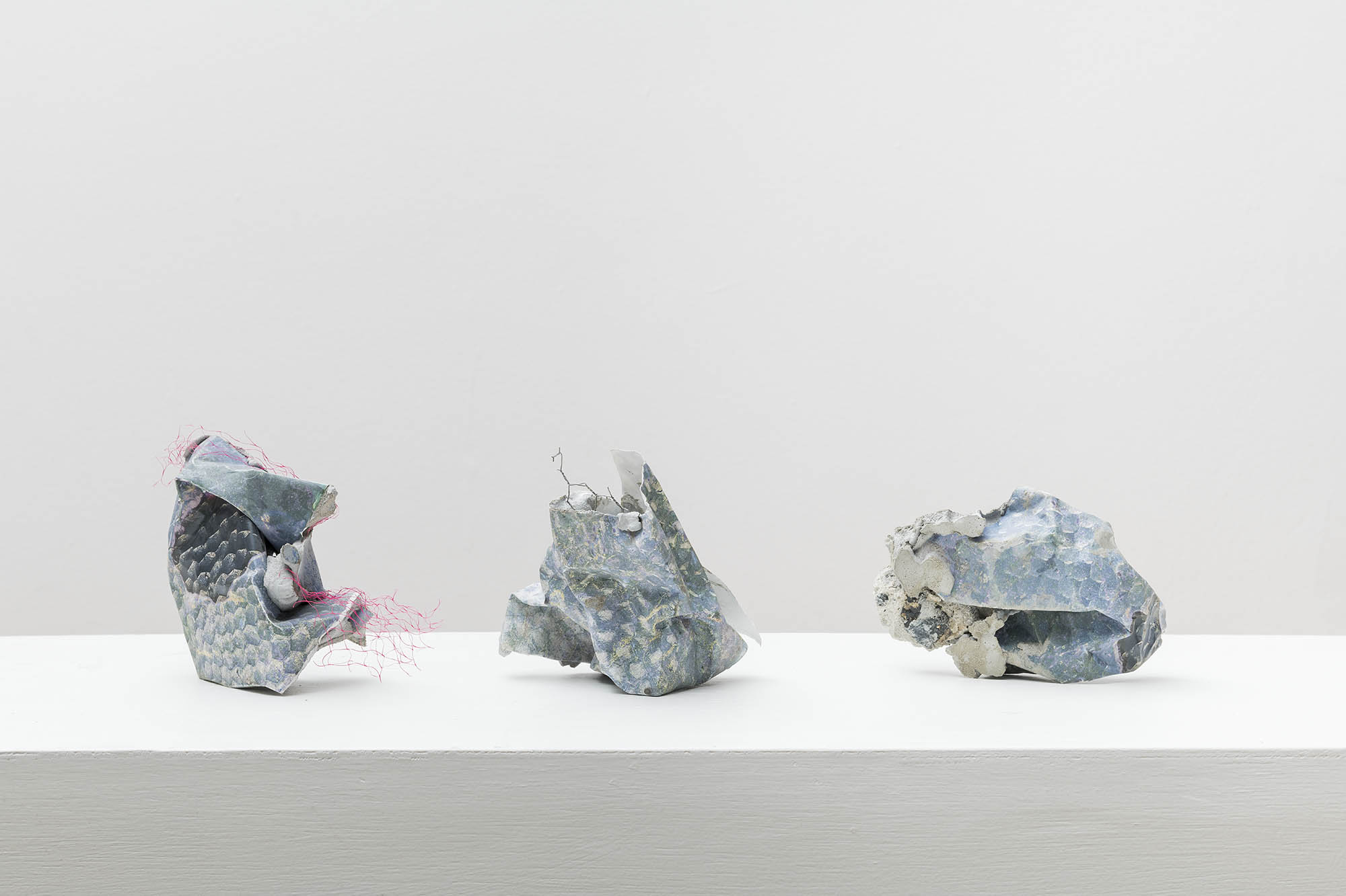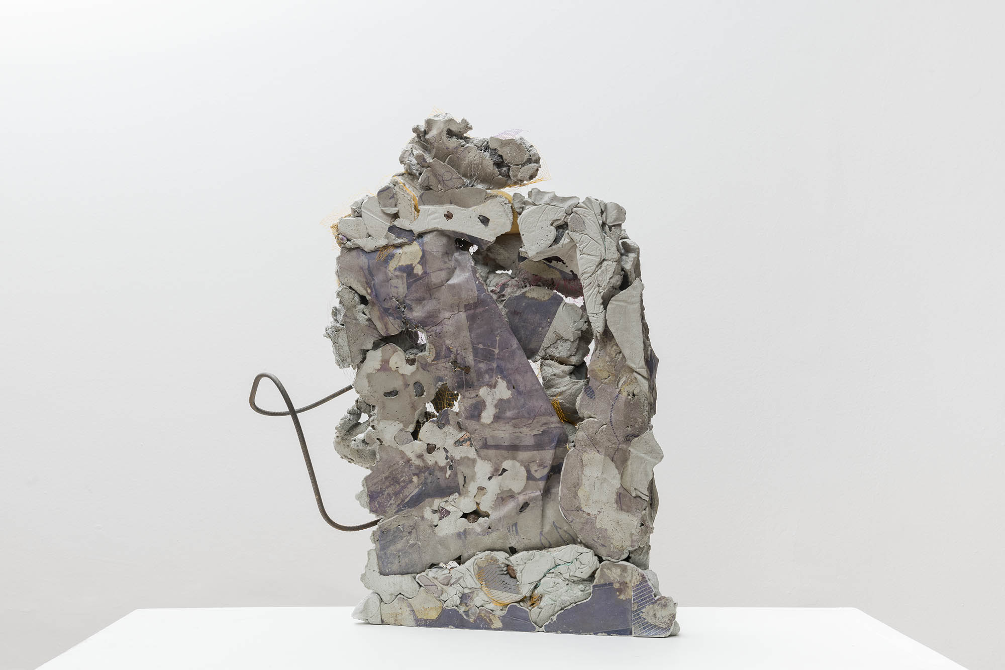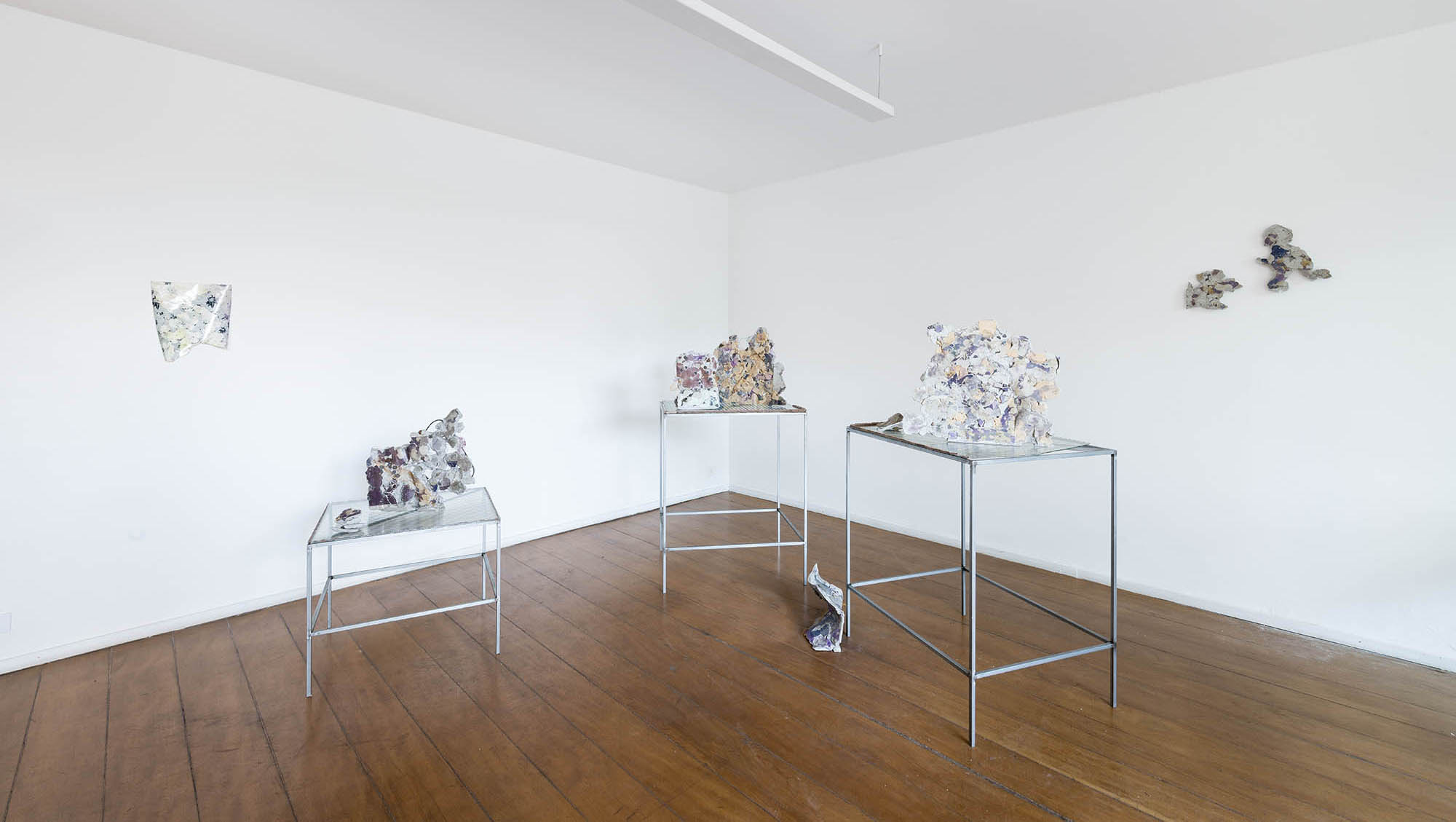 O conjunto de “foto-esculturas” que Ana Clara Tito mostra no auroras são formados por blocos de concreto com impressões fotográficas por transferência. O acervo fotográfico da artista acrescenta à essas novas obras, mais do que imagens, um espectro cromático de tons azulados e púrpura, resultado da transferência de tinta do papel para o concreto. Poderíamos contrapor esse acervo pessoal – que por fim revela-se muito pouco – com a crueza dos destroços de concreto, ruína de um projeto de construção. Elementos estruturais, como vergalhões e pedras, aparecem das entranhas desses objetos, misturados ainda não com redes de proteção da construção civil, mas com redes de vegetais de feira, aproximando novamente dois universos distintos. Grande parte das obras foram realizadas este ano durante sua residência na Fundação Armando Alvares Penteado (FAAP), em São Paulo.