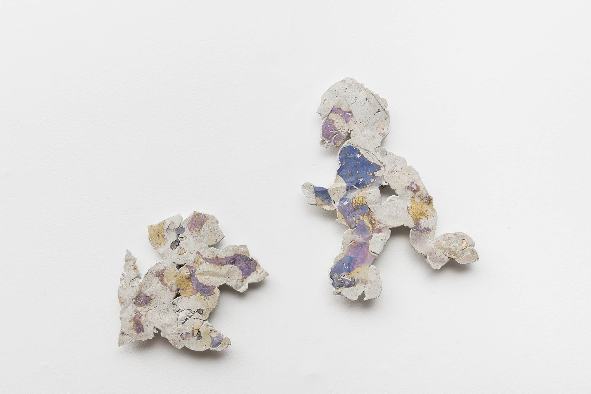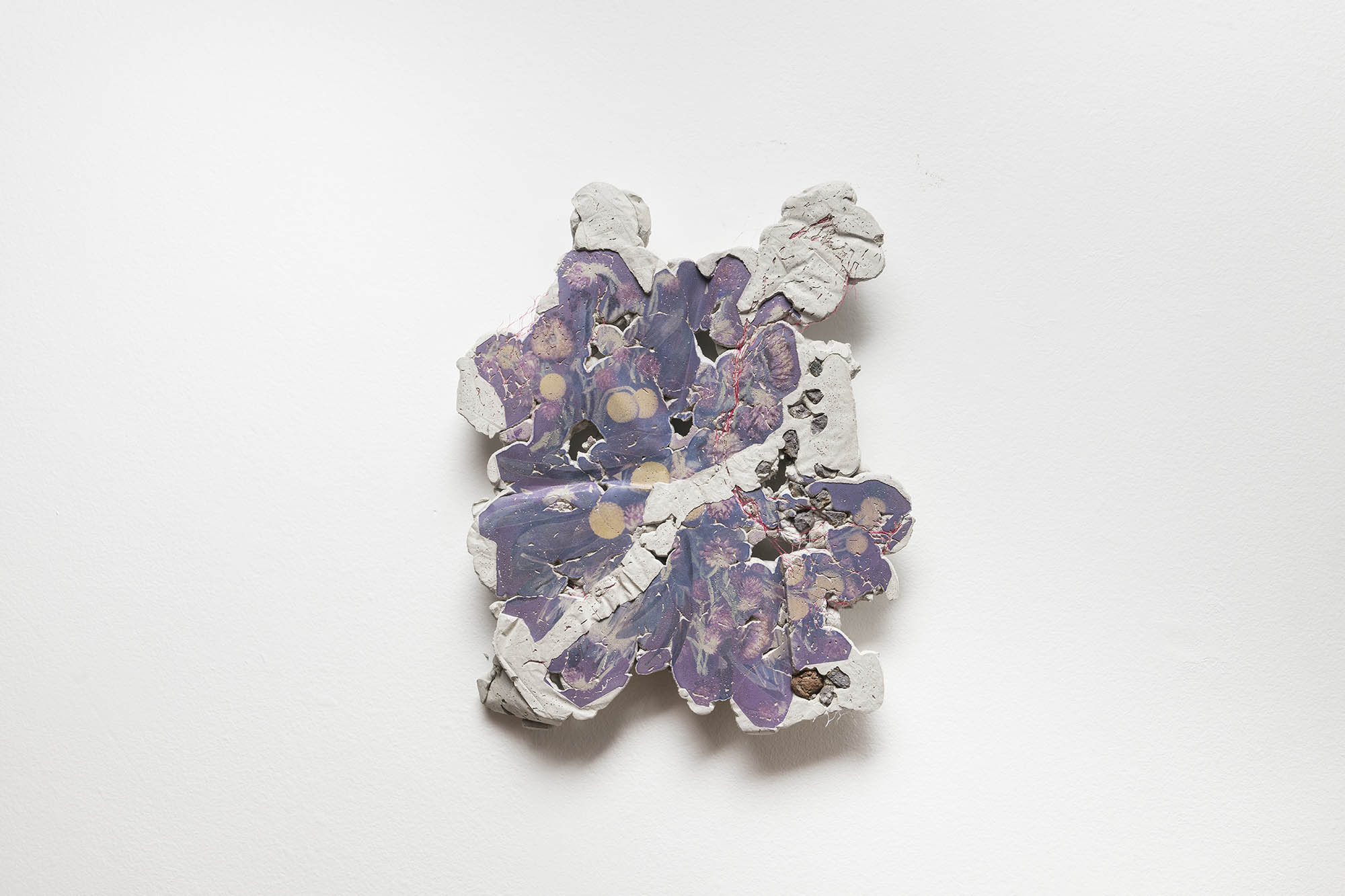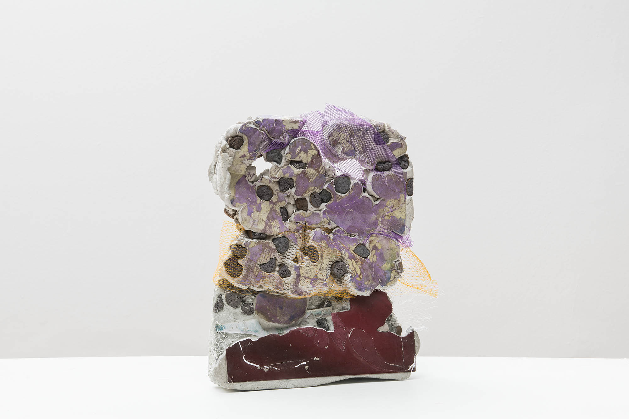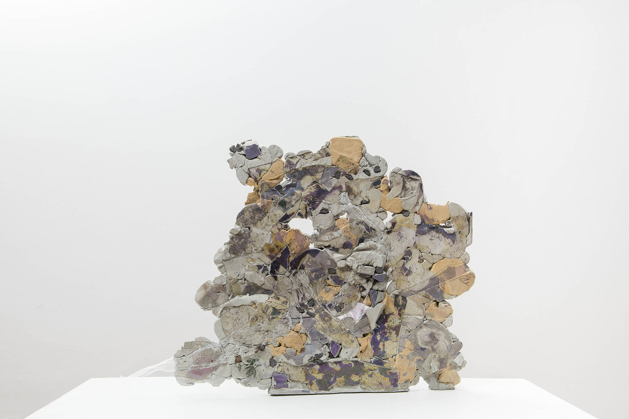 O conjunto de “foto-esculturas” que Ana Clara Tito mostra no auroras são formados por blocos de concreto com impressões fotográficas por transferência. O acervo fotográfico da artista acrescenta à essas novas obras, mais do que imagens, um espectro cromático de tons azulados e púrpura, resultado da transferência de tinta do papel para o concreto. Poderíamos contrapor esse acervo pessoal – que por fim revela-se muito pouco – com a crueza dos destroços de concreto, ruína de um projeto de construção. Elementos estruturais, como vergalhões e pedras, aparecem das entranhas desses objetos, misturados ainda não com redes de proteção da construção civil, mas com redes de vegetais de feira, aproximando novamente dois universos distintos. Grande parte das obras foram realizadas este ano durante sua residência na Fundação Armando Alvares Penteado (FAAP), em São Paulo.