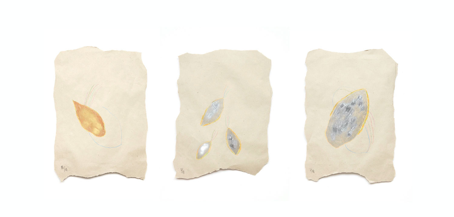 Esses elementos parecem estar sempre em relação entre eles. De um objeto, sujeito ou forma com o outro. Nos desenhos de Tadáskía as formas afetam umas às outras, as deformam num possível contato imanente. Essas relações são desenvolvidas em pequenos polípticos na obra da artista que, se por um lado dá um certo movimento à essas interações entre as formas, a repetição de um mesmo tamanho de suporte, mesmo que alterados em pontos diferentes, reitera um padrão sobre o qual se atua. Cada grupo utiliza-se de um tipo de papel colorido sobre o qual a artista intervém com diversos materiais, lápis colorido e grafite, esmalte de unha e iluminador de rosto.