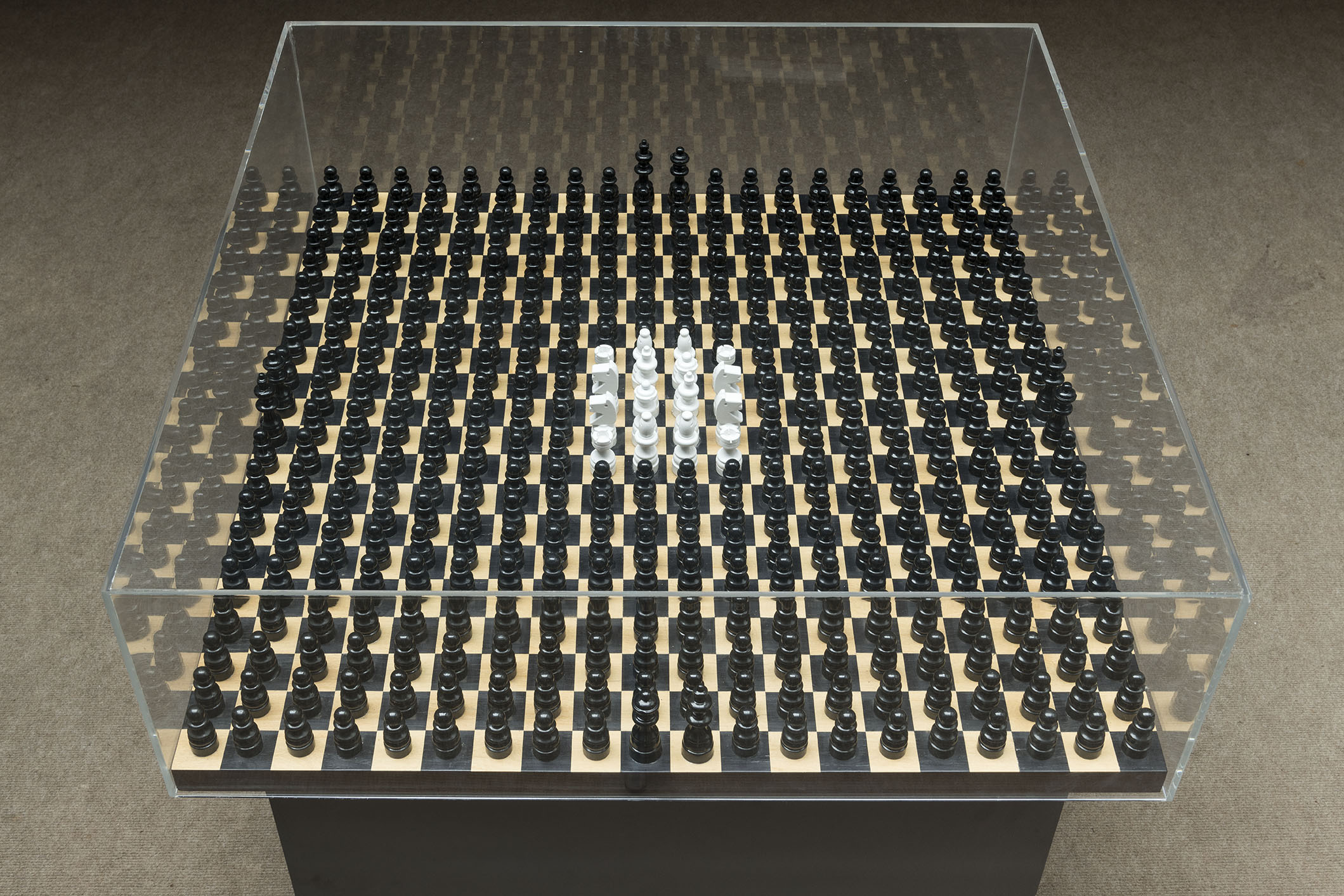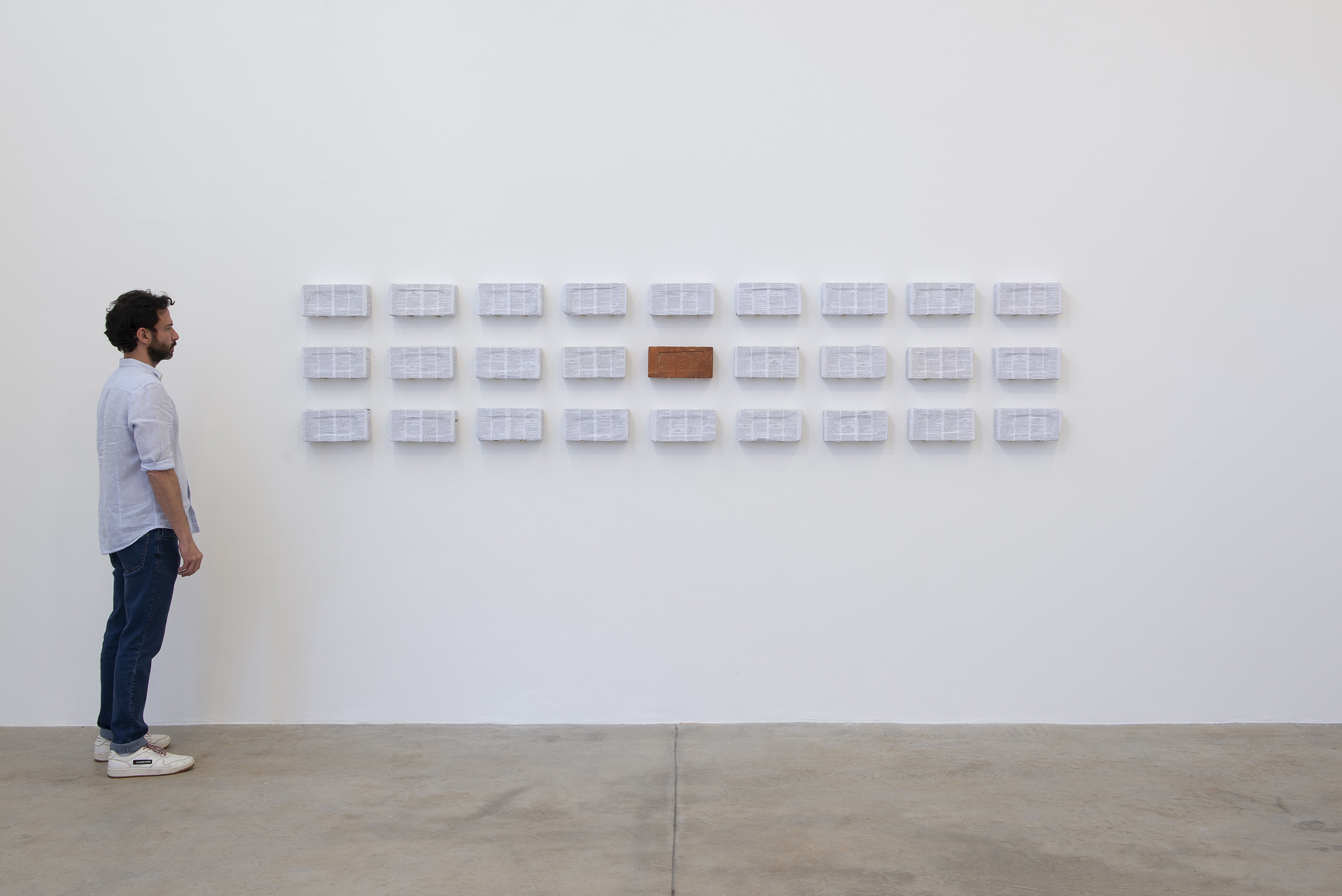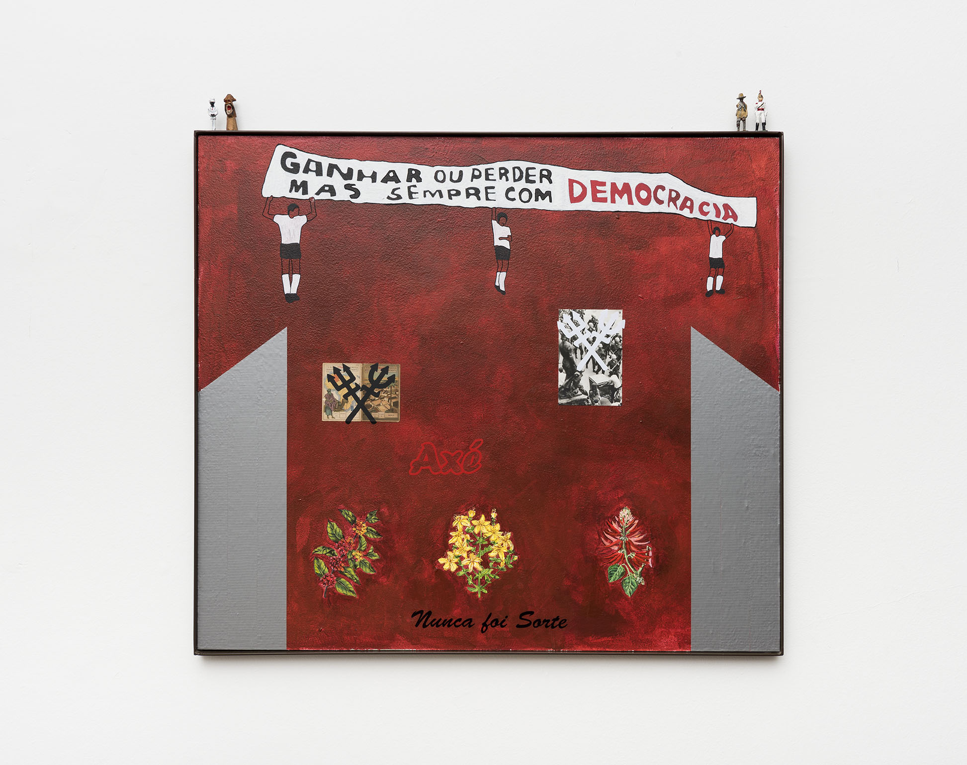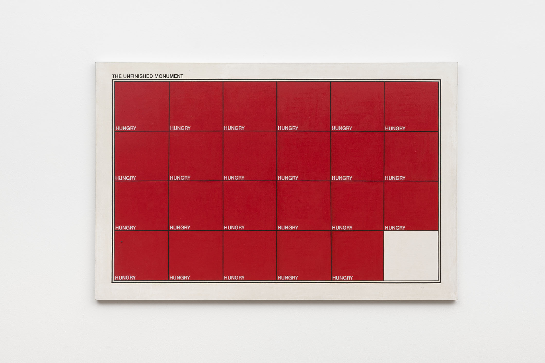 O título da exposição parte da obra de Antonio Dias “The Unfinished Monument II” (1969). A pintura, de seu período conceitual, inscreve sobre um plano vermelho o quadriculado familiar de suas obras dentro dos quais a palavra “Hungry” [Fome] é repetida, com exceção do último quadrante. Essa obra, que é apresentada publicamente pela primeira vez, foi ponto de partida para pensar a situação atual do país e as diferentes mazelas que devemos enfrentar enquanto sociedade.